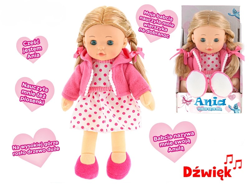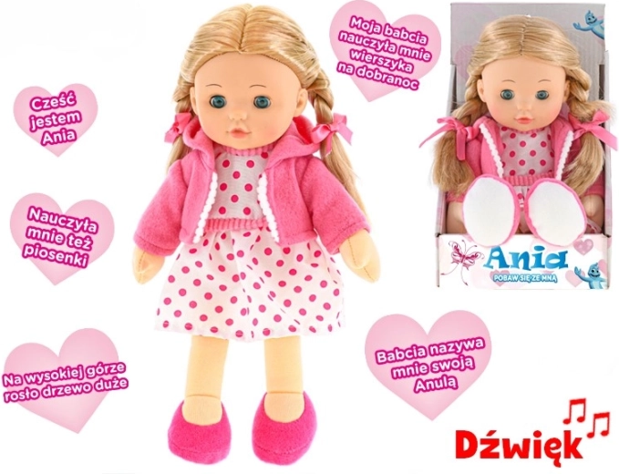 Păpușa Ania este concepută pentru cei mai mici copii, care vor aprecia corpul ei plăcut și moale și detaliile realiste. Datorită frazelor și sunetelor în limba poloneză, susține într-un mod jucăuș dezvoltarea percepției lingvistice și a abilităților sociale. Ochii care clipesc și ținuta stilată sporesc realismul experienței de joc.