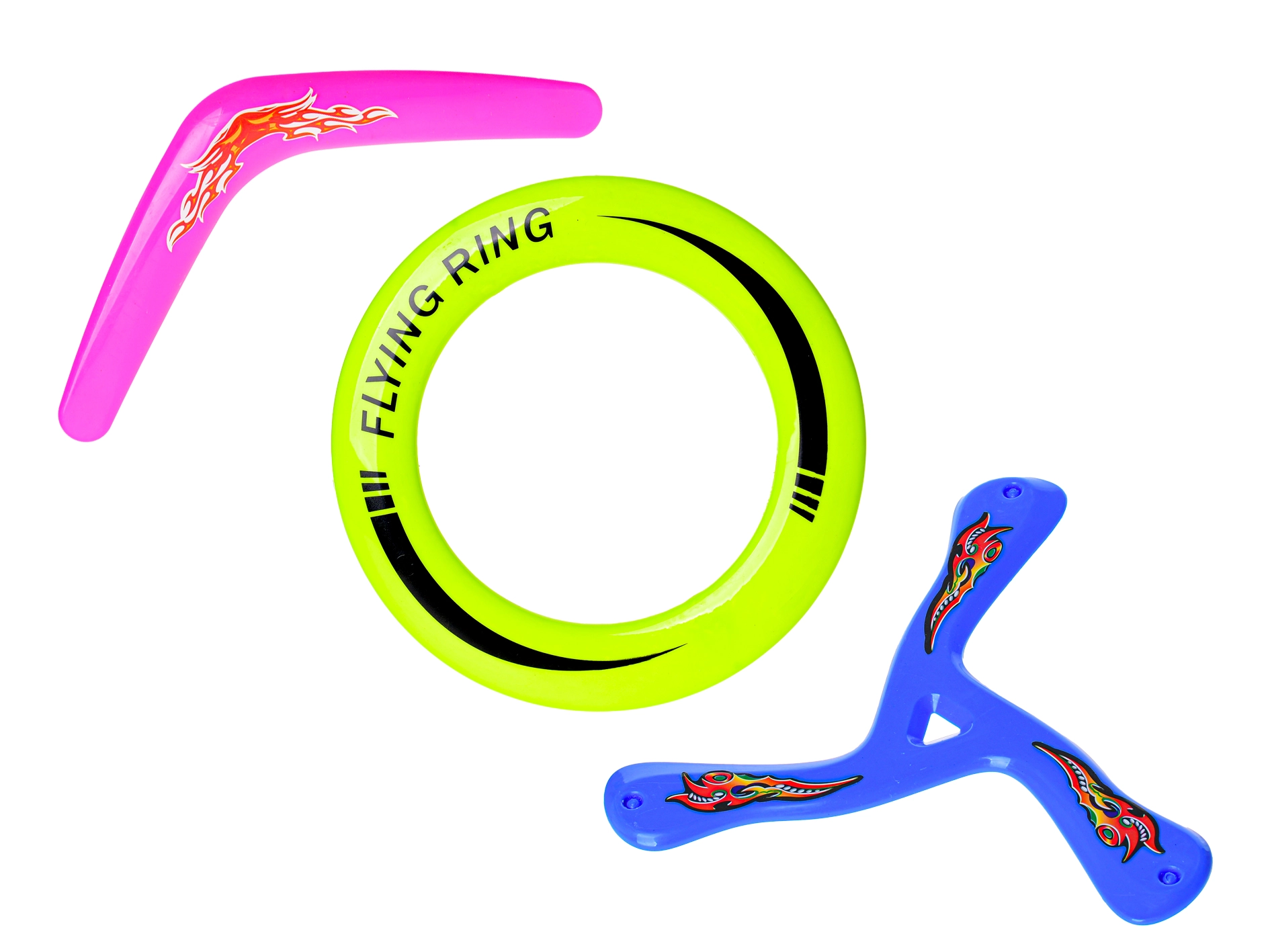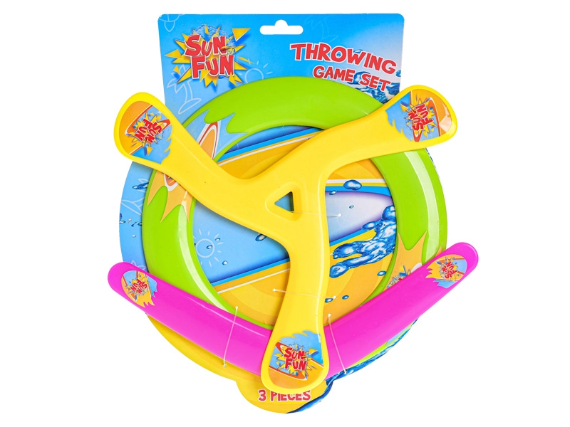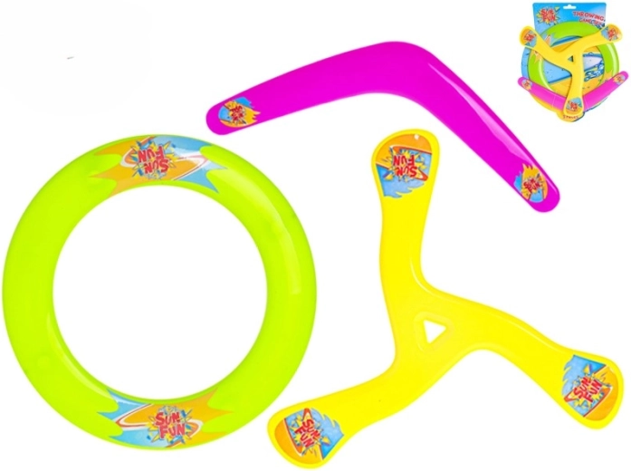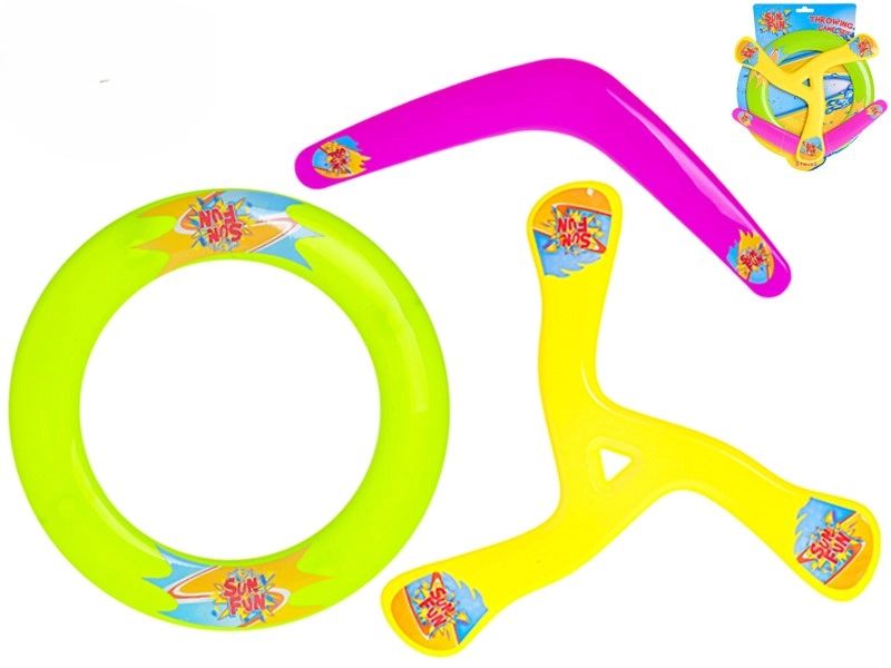 În pachet găsești trei tipuri diferite de jucării zburătoare – frisbee clasic, disc inelar și bumerang. Fiecare element aduce un stil diferit de joc și antrenament.