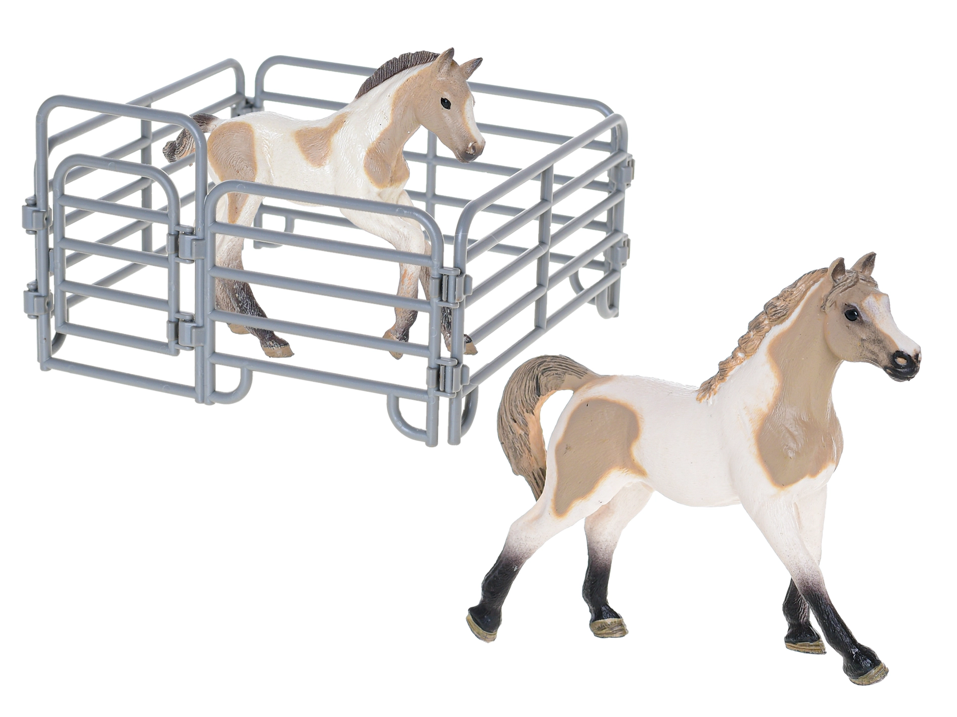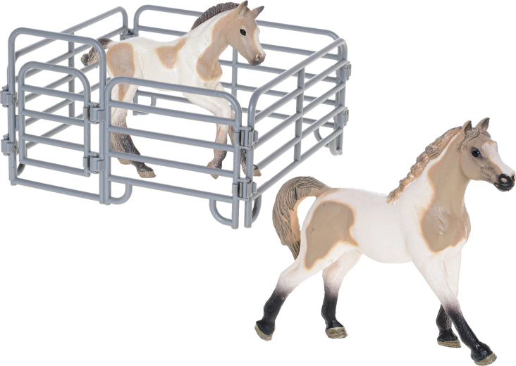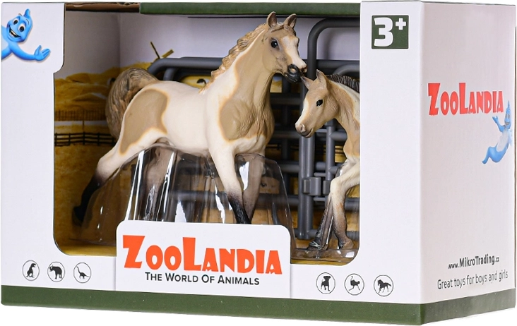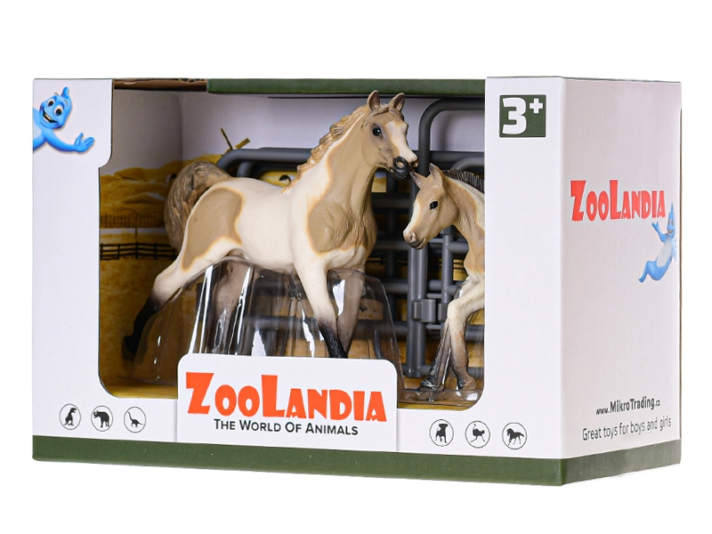 Extindeți lumea fanteziei copiilor cu un frumos set de figurine cal cu mânz și accesorii din colecția Zoolandia. Figurinele din plastic realizate realist, în 4 variante (alb cu pete, maro cu pete, maro deschis, maro închis), susțin jocul creativ și construirea propriei ferme. Ideal ca cadou pentru copii de la 3 ani.