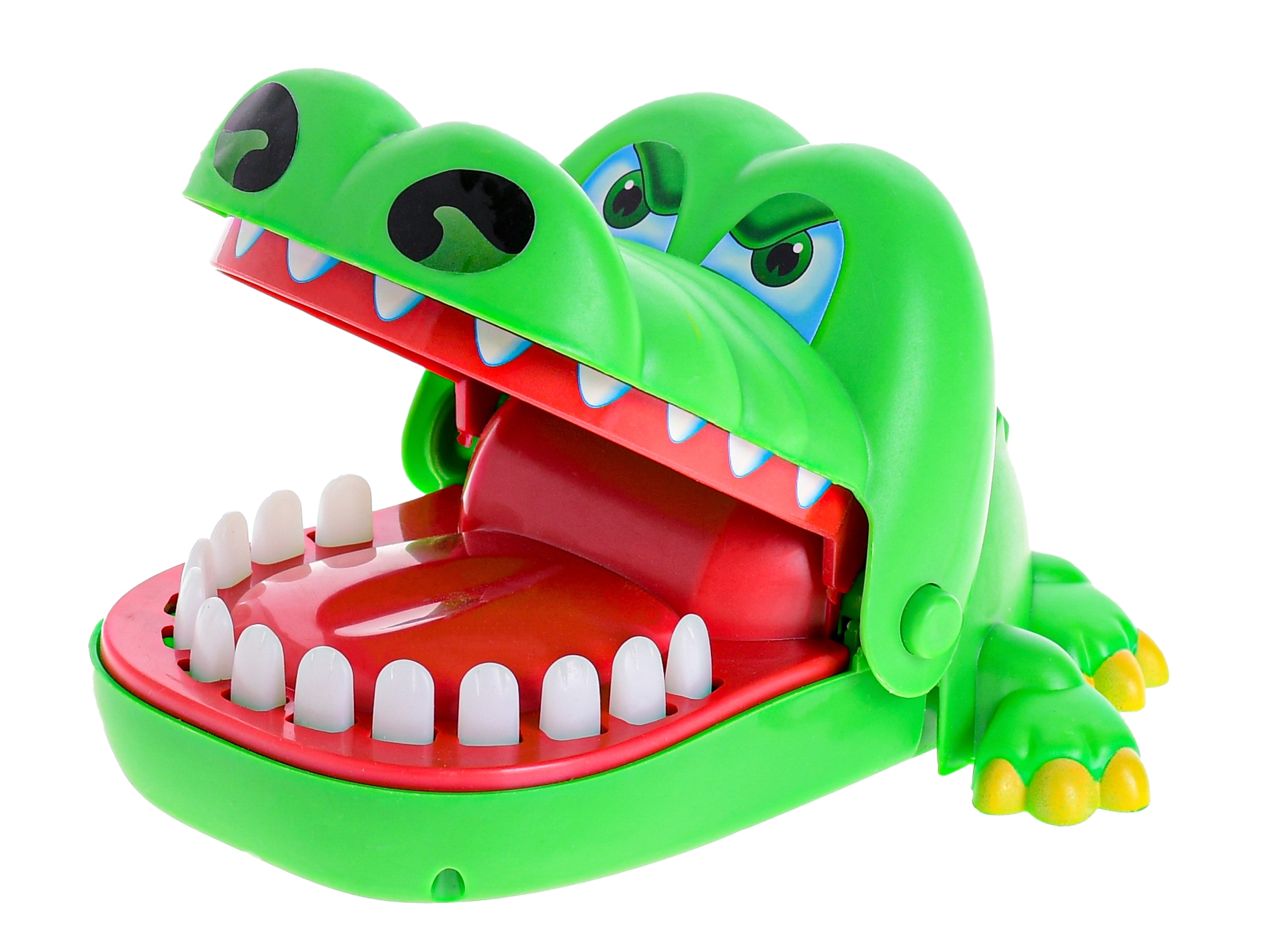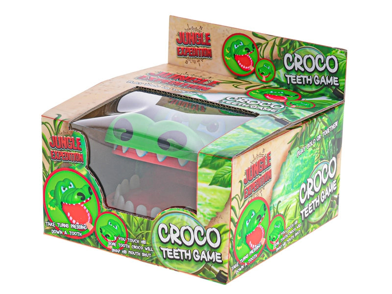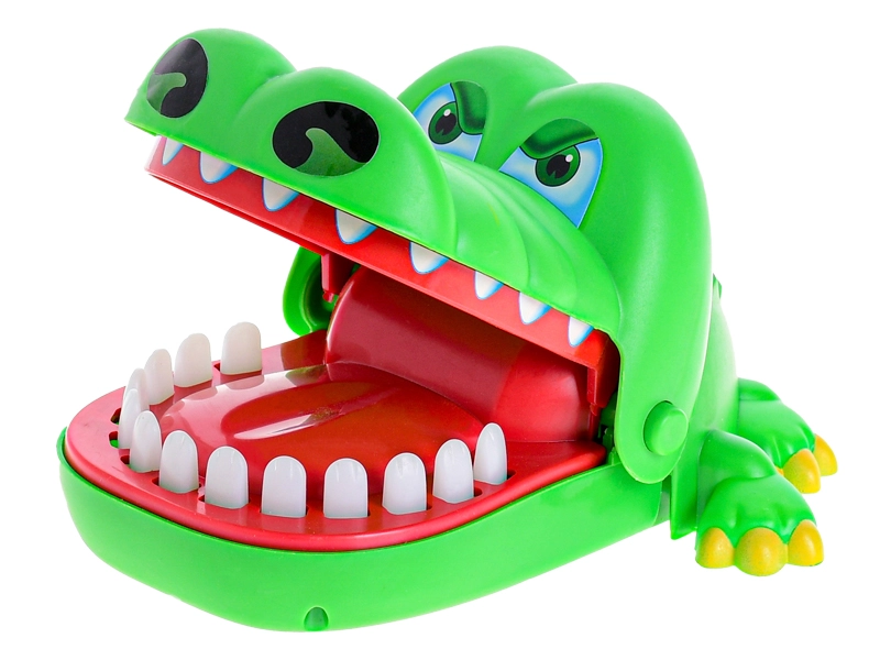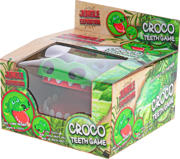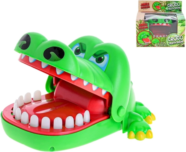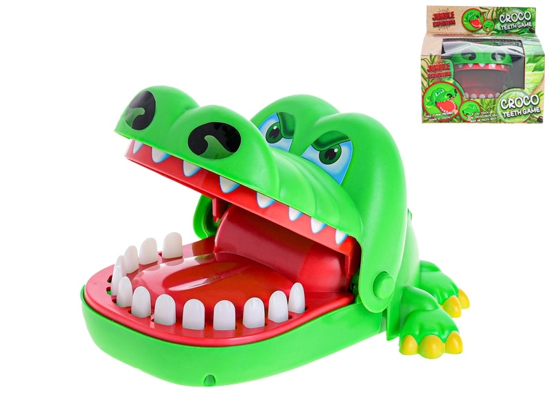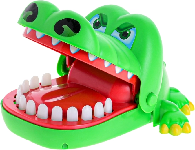 Un crocodil verde vesel, cu fălcile care se deschid, aduce acțiune palpitantă în fiecare joc. Jucătorii aleg pe rând dinții și îi apasă ușor – unul dintre ei declanșează închiderea instantanee a fălcilor, care surprinde și stârnește râsul întregului grup.