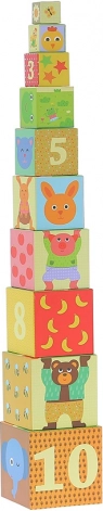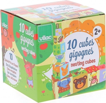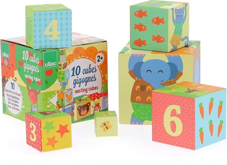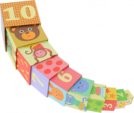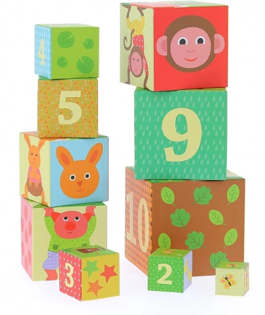 Acest turn colorat de la marca VILAC conține 10 cuburi rezistente din carton, cu laturi numerotate și ilustrații cu animale. Copiii pot construi un turn înalt sau pot introduce cuburile unul în altul, exersând astfel în mod natural număratul, diferențierea mărimilor și echilibrul.
