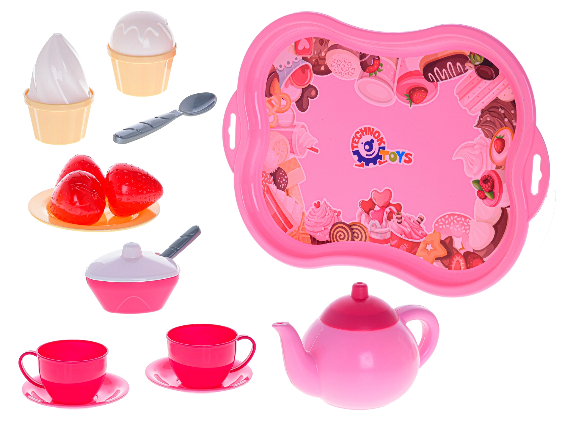 Ceainicul, ceștile cu farfurioare, lingurițele, deserturile și fructele sunt aranjate ordonat pe o tavă stilată – tot ce au nevoie copiii pentru servire.