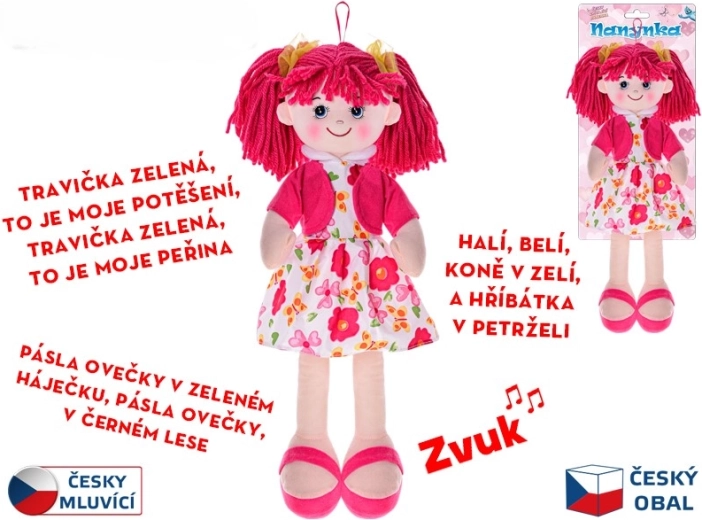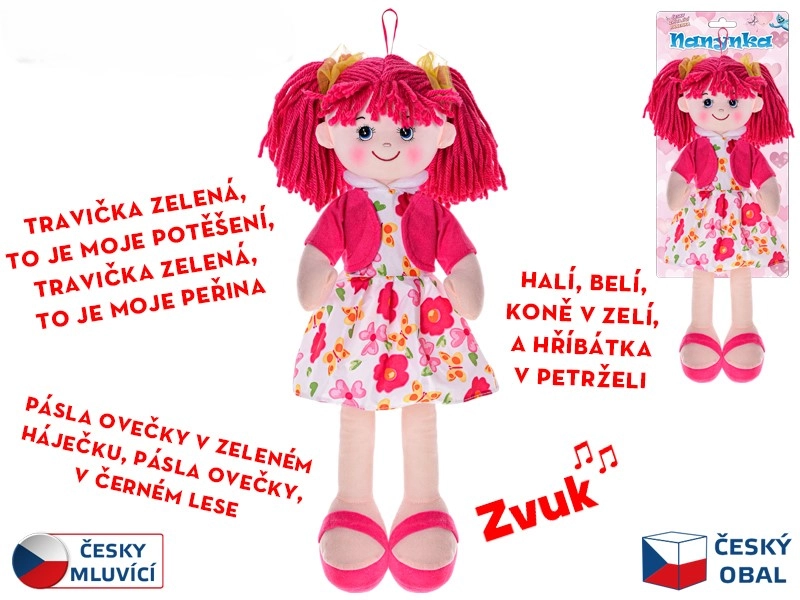 Păpușa textilă Nanynka, adorabilă, cu un corp moale și înălțimea de 50 cm, este ideală pentru cei mai mici. La apăsarea burticii, vorbește și cântă cântece în limba cehă, dezvoltă auzul și vorbirea și, datorită execuției moi, este sigură încă de la naștere. Bateriile sunt incluse, astfel încât este gata de joacă imediat după despachetare.