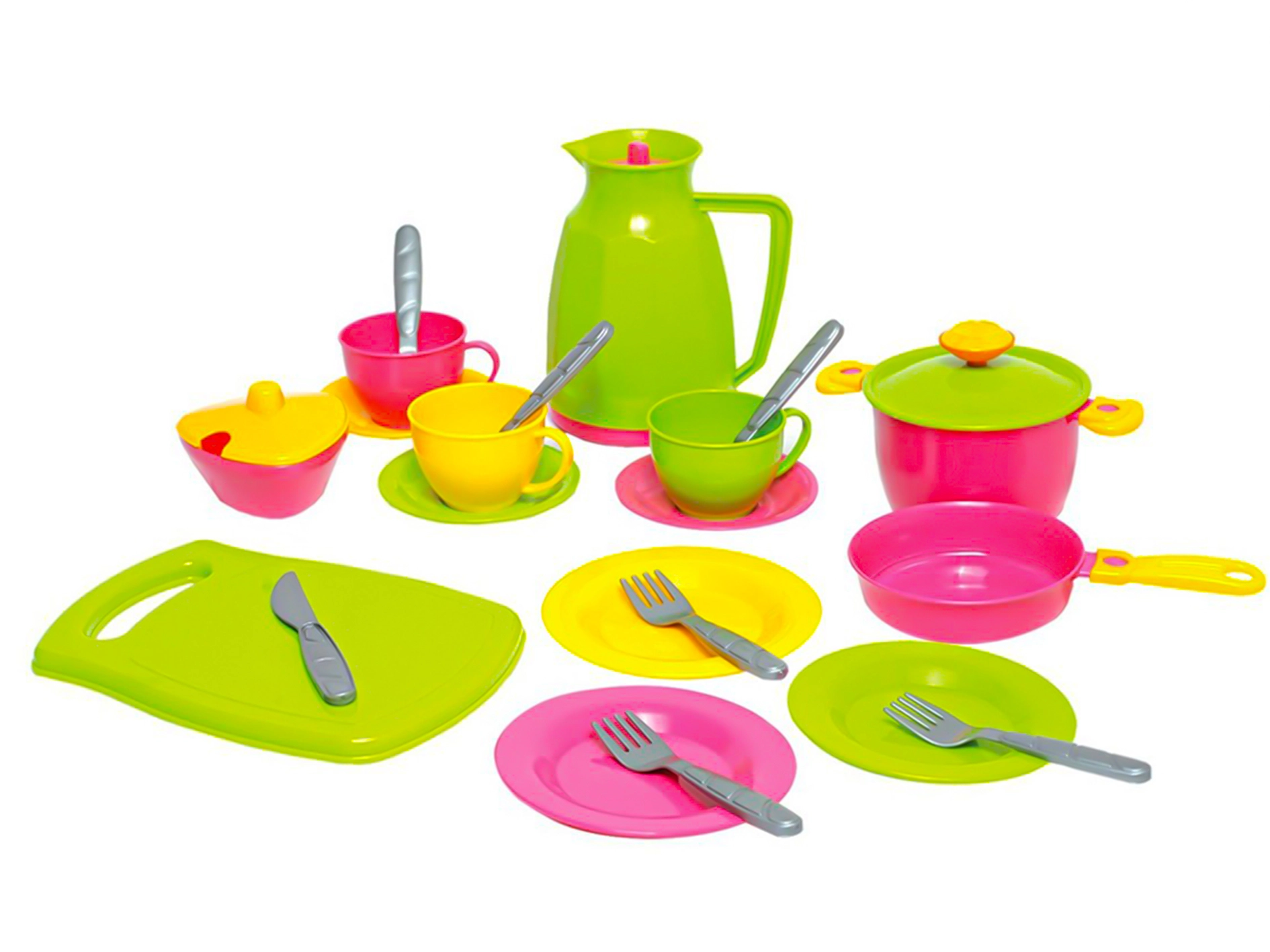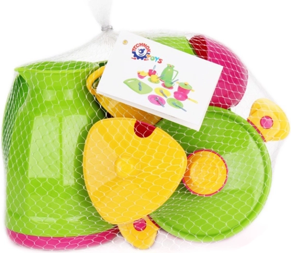 Copiii găsesc tot ce au nevoie pentru gătit și servire: ceainic, oală cu capac, tigaie, farfurii, tacâmuri, tocător, zaharniță, cești și farfurioare. Ideal pentru jocuri de rol creative.
