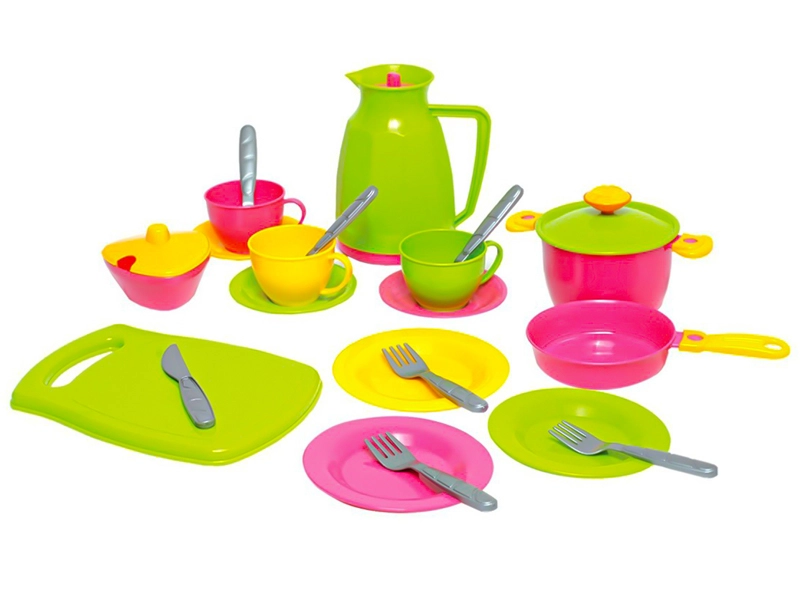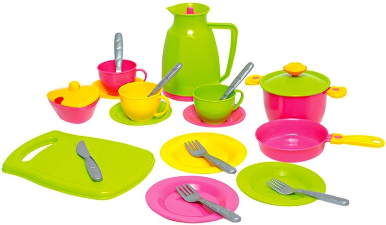 Setul este fabricat din plastic de calitate, care rezistă jocului zilnic. Culorile vii și piesele variate – de la ceainic la oală și tigaie, până la farfurii, tacâmuri și cești – susțin combinațiile creative și învățarea obiceiurilor de bază la masă.