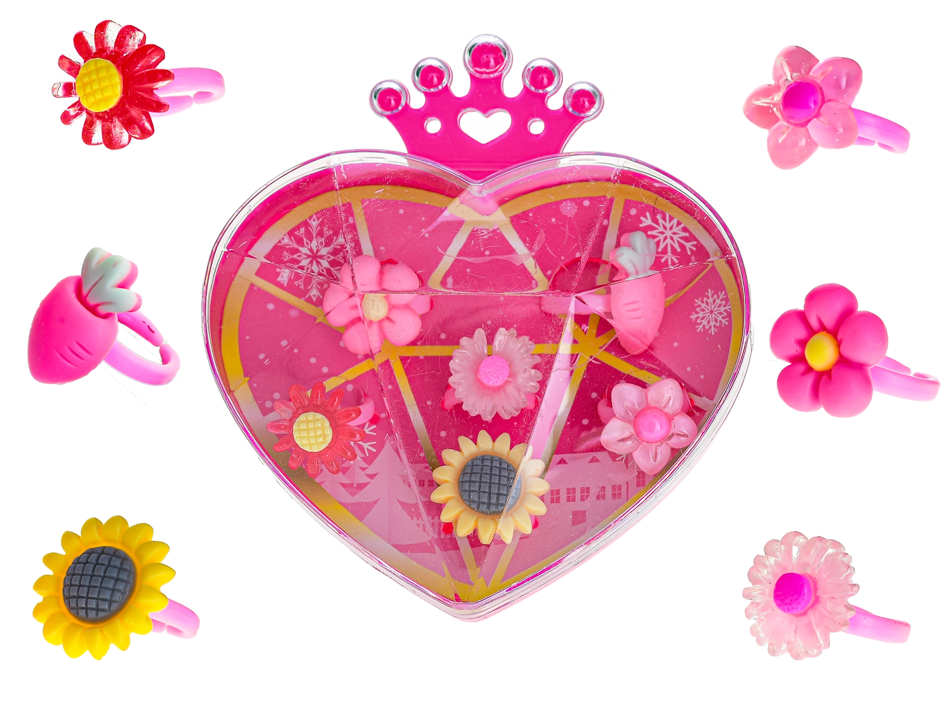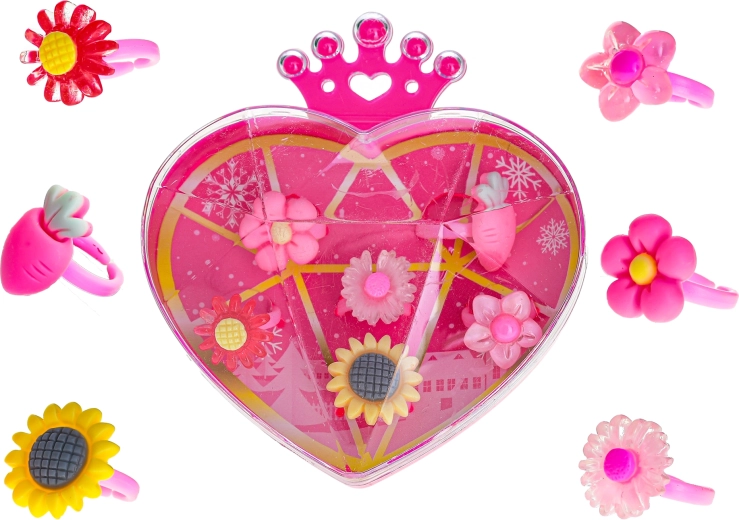 Set drăguț de 6 inele pentru copii într-o cutie adorabilă în formă de inimă, care va încânta orice mică domnișoară. Inelele din plastic ușor sunt decorate cu motive 3D colorate, care stimulează imaginația și jocul. Datorită partei din spate deschise au mărime universală și se adaptează ușor degețelelor mici. Ideal pentru copii de la 3 ani – acasă și în călătorii.