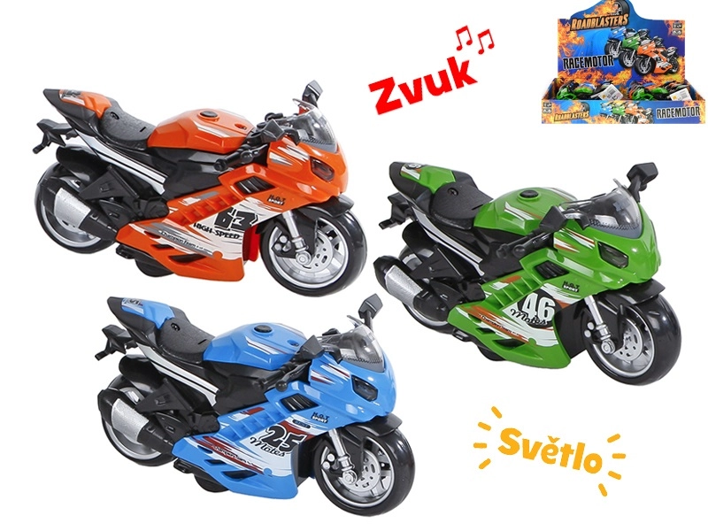 Motocicleta din plastic Roadblasters cu lungimea de 14,5 cm îi va încânta pe micii fani ai motocicletelor. Datorită mecanismului cu volantă, după întindere pornește singură, iar efectele luminoase și sonore amplifică experiența realistă și susțin dezvoltarea abilităților motorii. Disponibilă în trei culori, cu baterii incluse în pachet, potrivită de la 3 ani.