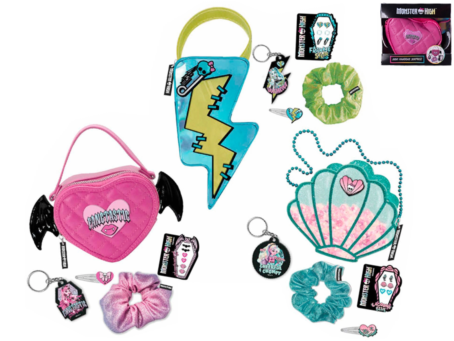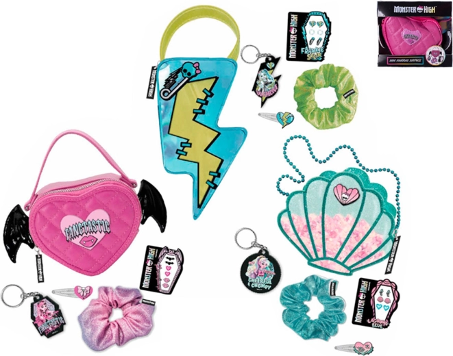 Mini geantă stilată pentru micii fani MONSTER HIGH care aduce distracție și un plus de stil. Disponibilă în trei modele – scoică, fulger și inimă – fiecare variantă include accesorii tematice, precum brelocuri și ornamente pentru păr. Datorită dimensiunilor compacte, este perfectă pentru joacă, colecționare și purtare. Fabricată din plastic de calitate, potrivită pentru copii de la 5 ani.
