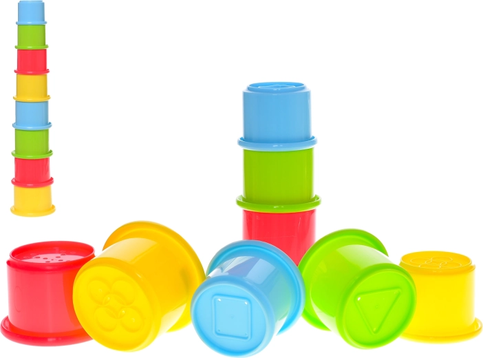 Descoperiți un set distractiv de opt cănuțe colorate, care pot fi ușor stivuite într-un turn stabil. Jucăria este ideală pentru copii de la 6 luni și sprijină dezvoltarea motricității fine, abilităților de coordonare și gândirii logice. Datorită diferitelor dimensiuni și culori, copiii învață recunoașterea culorilor și formelor, în timp ce suprafața în relief a cănuțelor stimulează percepțiile tactile. Plasticul ușor și rezistent asigură manipulare facilă, iar plasa practică simplifică transportul și depozitarea.