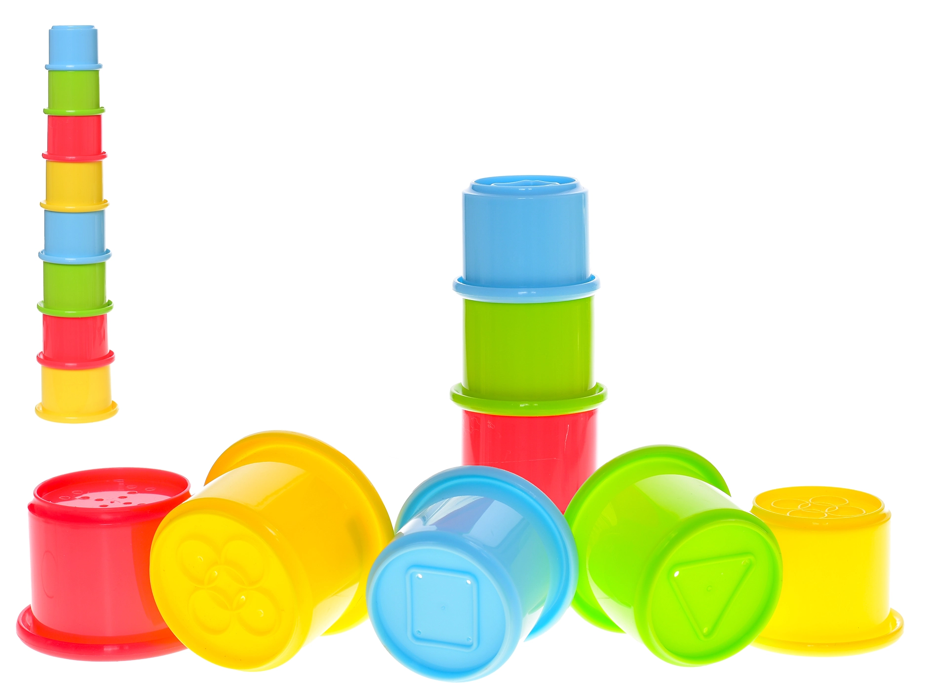 Fiecare cănuță are o suprafață în relief pentru stimularea percepției tactile și margini sigure pentru joacă fără griji. Plasa practică păstrează toate piesele laolaltă, acasă sau în deplasare.