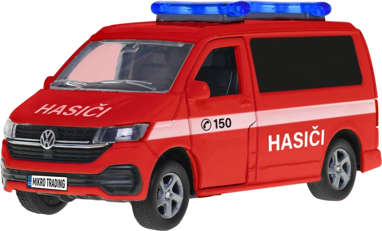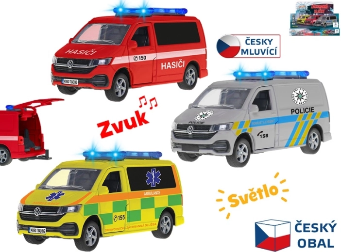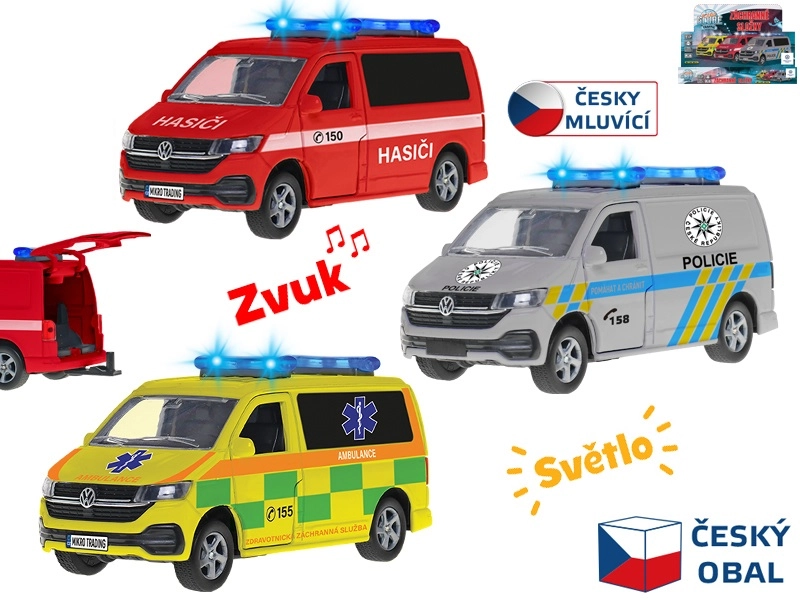 Vehicul de intervenție VW, realizat cu detalii fine, lungime 13,5 cm, din metal de calitate pentru micii salvatori și colecționari. Oferă mecanism de întoarcere (pull-back), efecte luminoase și semnale sonore în limba cehă. Datorită construcției solide din metal este excelent pentru joaca zilnică și este disponibil în variantele pompieri, ambulanță și poliție. Bateriile LR44 sunt incluse în pachet.