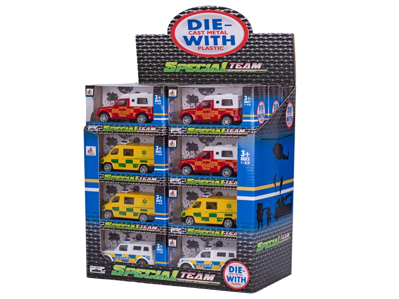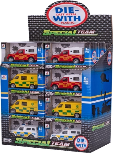 Acest set realist de modele metalice ale serviciilor de salvare aduce copiilor situații de joc autentice: de la patrula poliției la intervenția pompierilor și până la salvarea cu ambulanța. Datorită caroseriei metalice rezistente cu detalii din plastic, roților libere și mecanismului de întoarcere, vehiculele pornesc rapid după ce sunt trase înapoi.