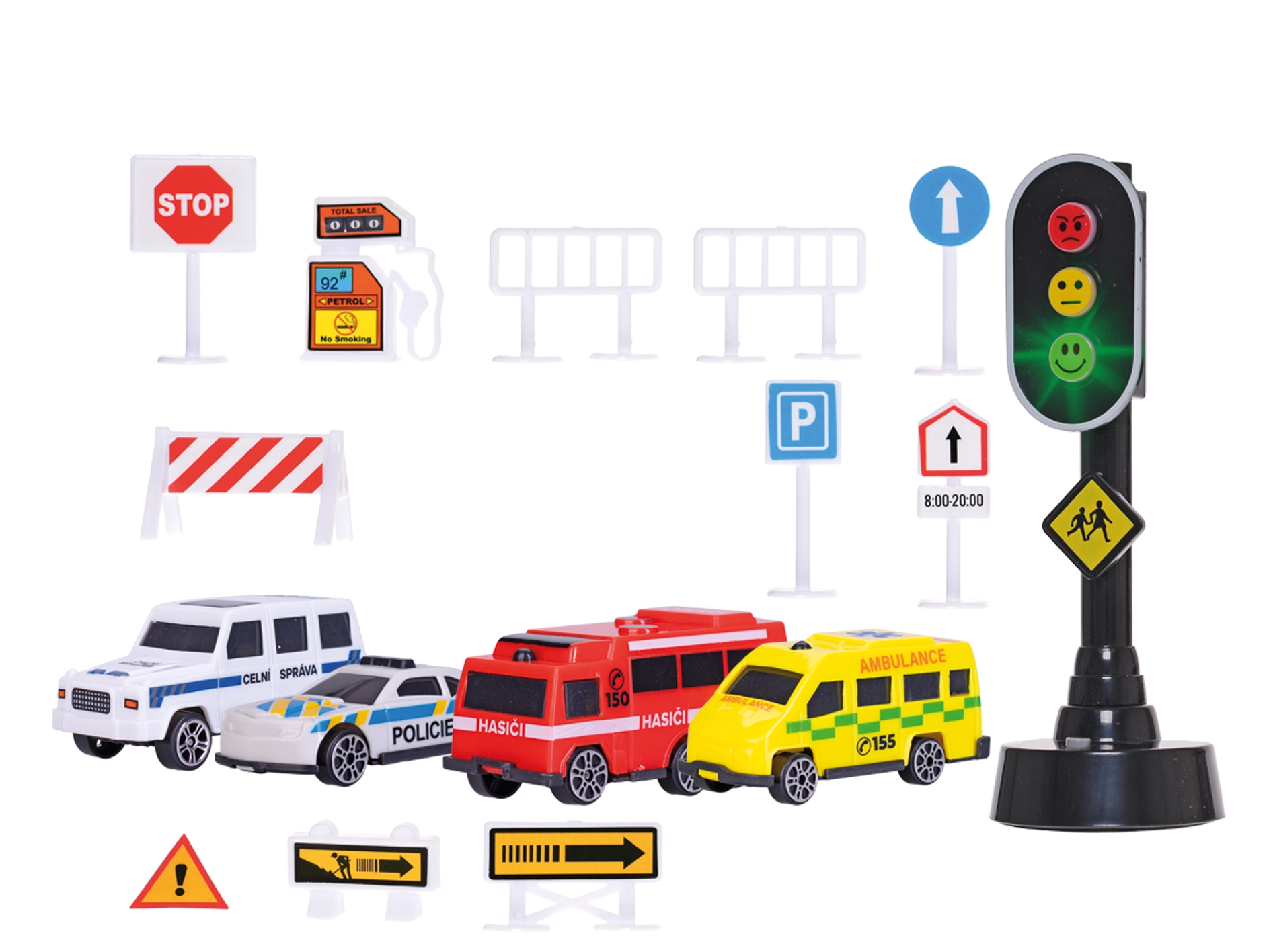 Este suficient să introduceți bateriile incluse și joaca poate începe. Setul de mașinuțe cu indicatoare rutiere și semafor este baza perfectă pentru primele aventuri rutiere acasă și în deplasare.