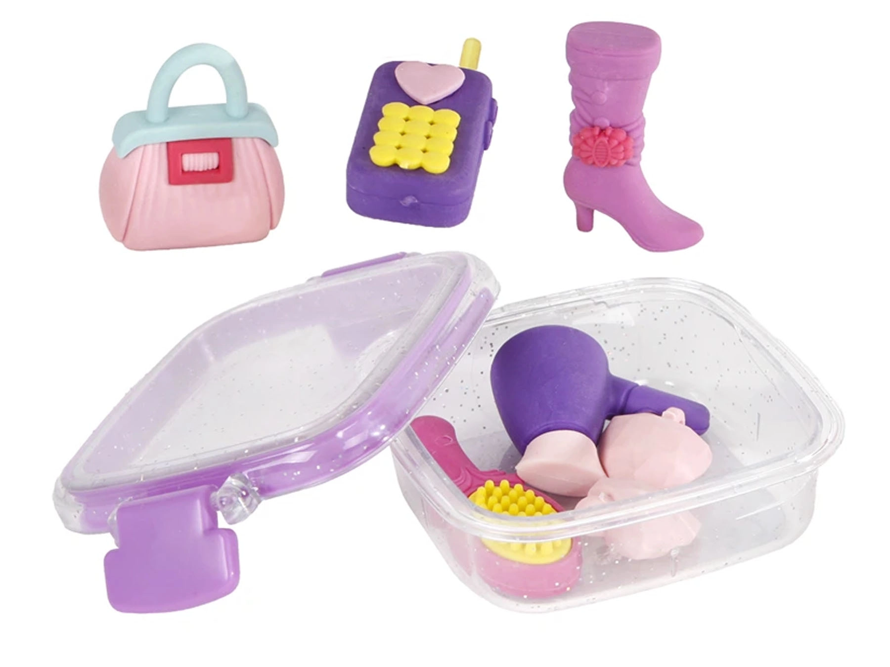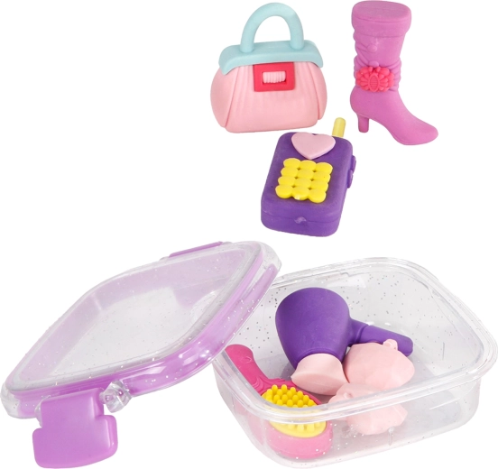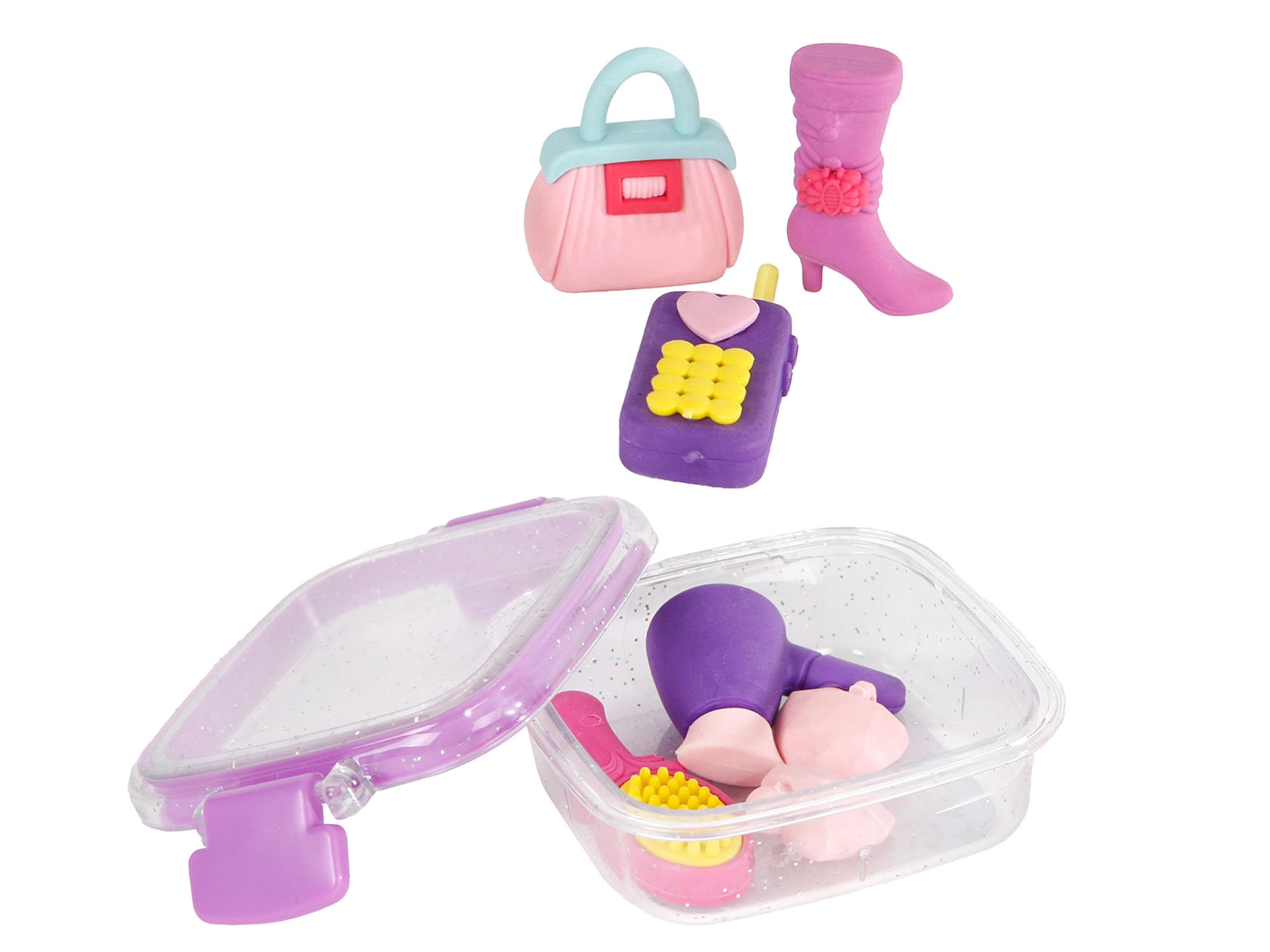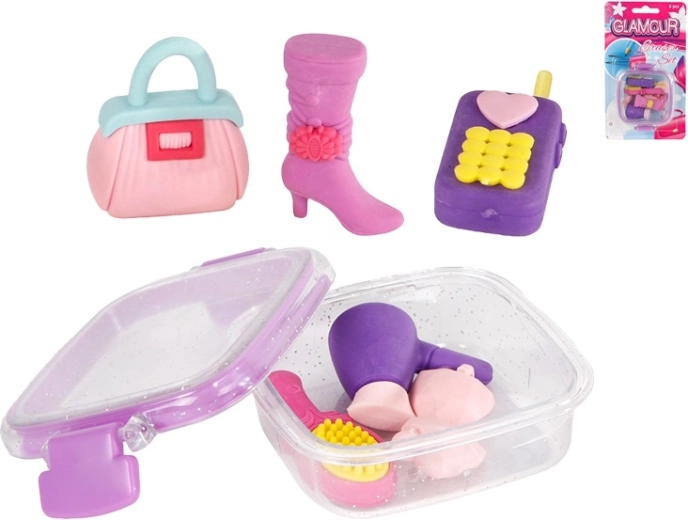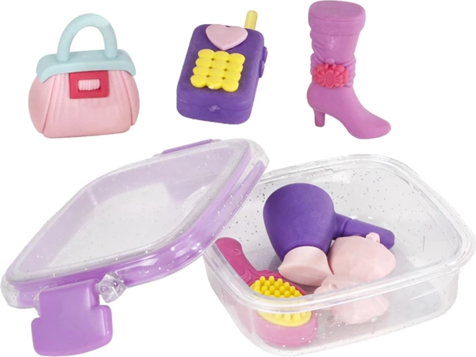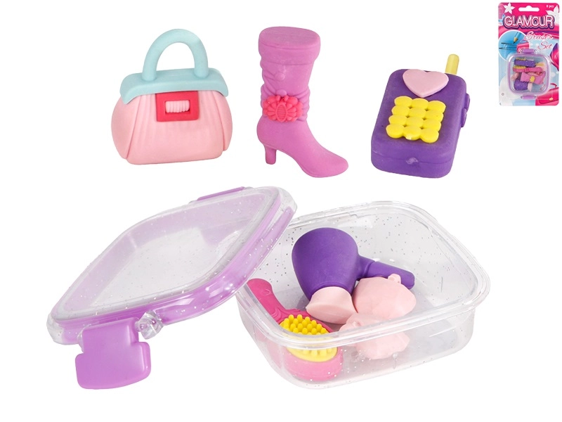 Setul stilat Glamour aduce distracție și practică în penarul școlar. Conține 8 radiere originale în formă de accesorii de modă, precum telefon mobil, pantof sau geantă. Fiecare radieră din cauciuc de calitate asigură ștergere fină și eficientă fără a deteriora hârtia, este rezistentă și, datorită cutiuței practice, o ai mereu la îndemână. O alegere excelentă pentru copii de la 3 ani.