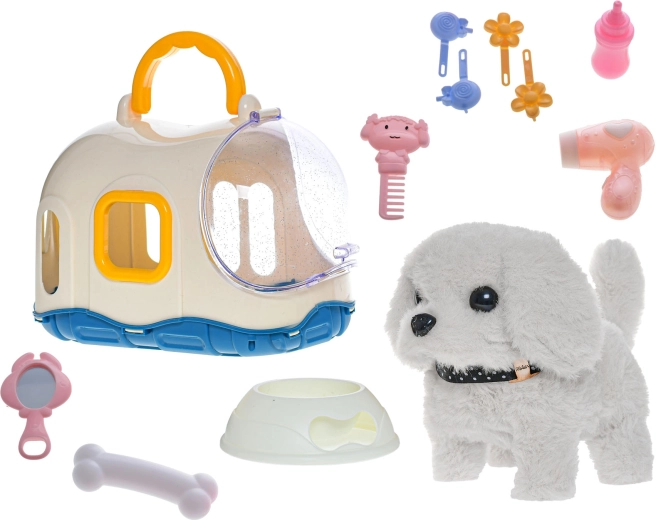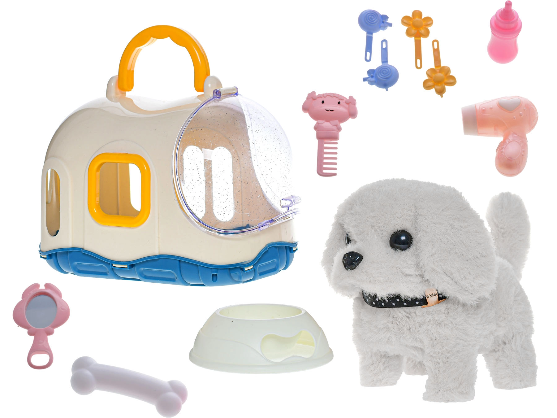 Adorabilul cățeluș interactiv de pluș, cu dimensiunea de 19 cm, știe să meargă și să latre, aducând copiilor multă bucurie și distracție. Datorită mişcărilor realiste, stimulează imaginația și empatia în jocurile de îngrijire a unui animal de companie. Pachetul include o cutie de transport pentru transport ușor. Potrivit pentru copii de la 3 ani.