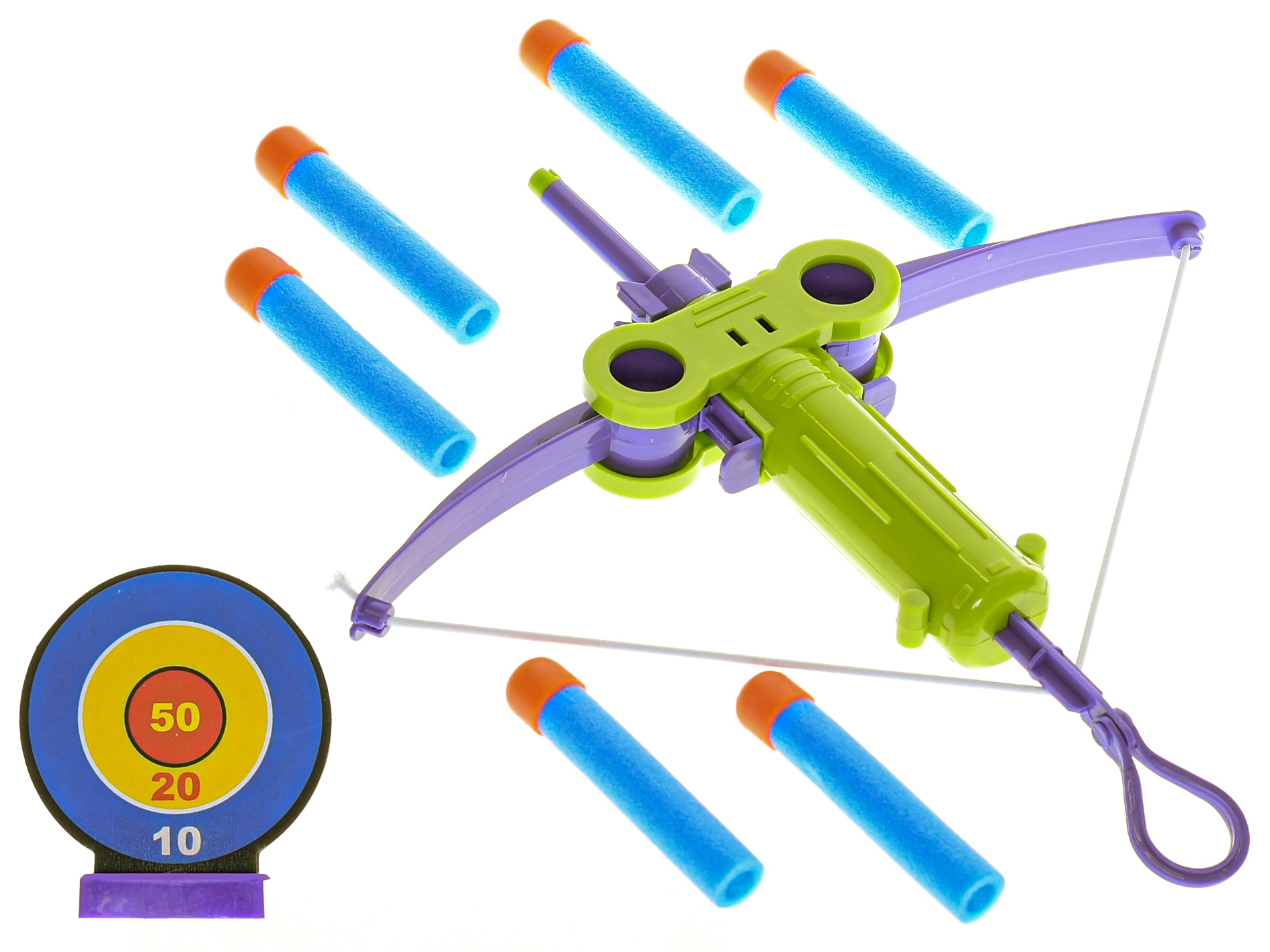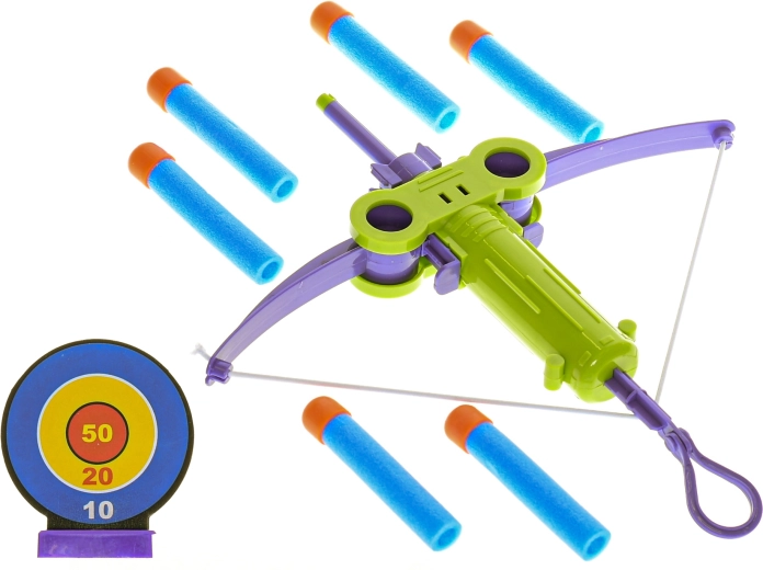 Arbaletă pentru copii, distractivă și sigură, cu țintă și șase proiectile din spumă pentru micii trăgători de la 3 ani. Susține motricitatea, coordonarea mână-ochi și concentrarea. Disponibilă în două culori – albastru și verde – pentru și mai multă bucurie de joc acasă și în aer liber.