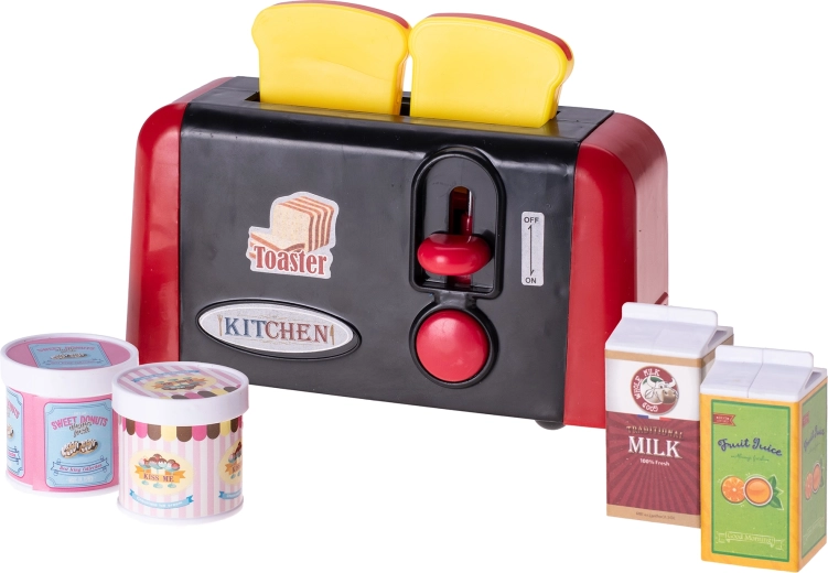 Oferiți micilor bucătari un accesoriu stilat pentru bucătăria de jucărie. Prăjitorul de pâine cu mecanism cu arc și accesorii le permite copiilor să imite pregătirea reală a micului dejun și oferă o experiență autentică de gătit. Datorită dimensiunilor compacte, încape ușor în orice bucătărie de joacă.