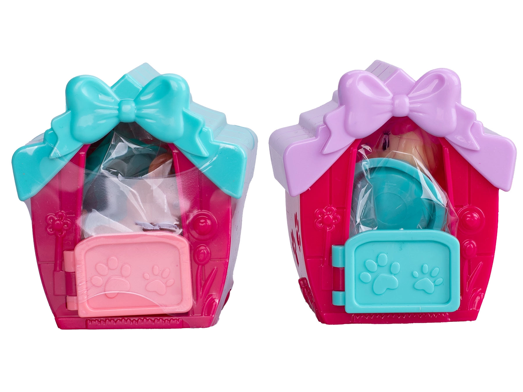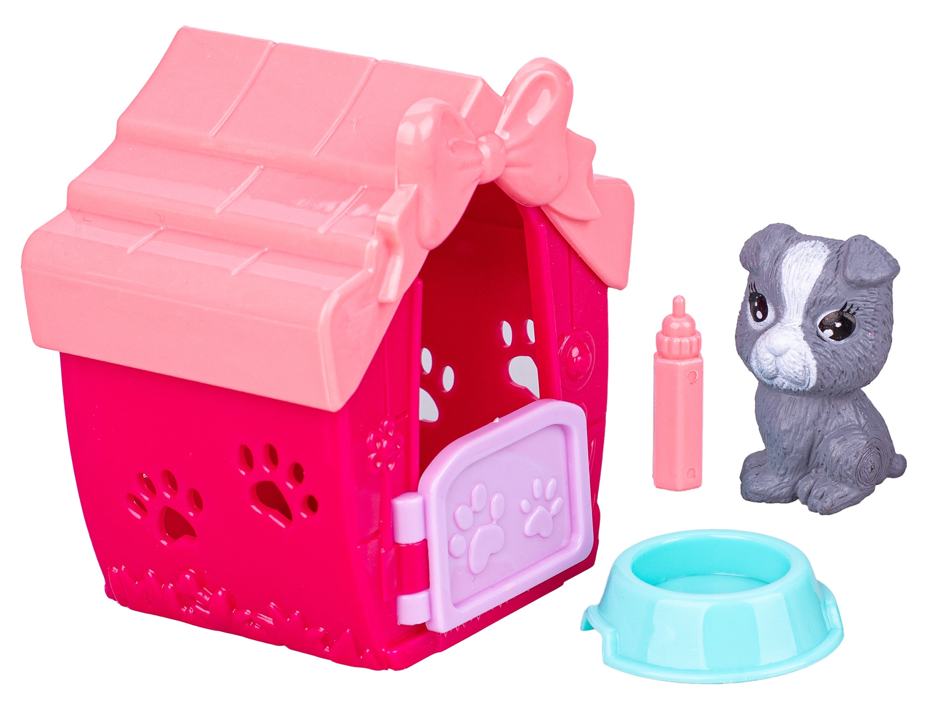 Căsuță colorată cu fundiță și urme de lăbuțe are ușițe și ferestruici mobile, astfel încât copiii pot pune ușor cățelul înăuntru și îl pot transporta.