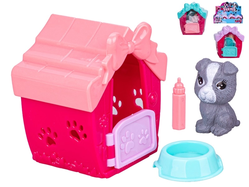 Descoperiți setul încântător cu cățeluș și căsuță, care le permite copiilor să aibă grijă de propriul animăluț. Căsuța colorată, cu fundiță decorativă și ferestre transparente, ascunde tot ce este necesar pentru joacă – de la bol până la biberon. Datorită designului ușor de depozitat, este ideală atât pentru camera copilului, cât și pentru rucsac în excursii.