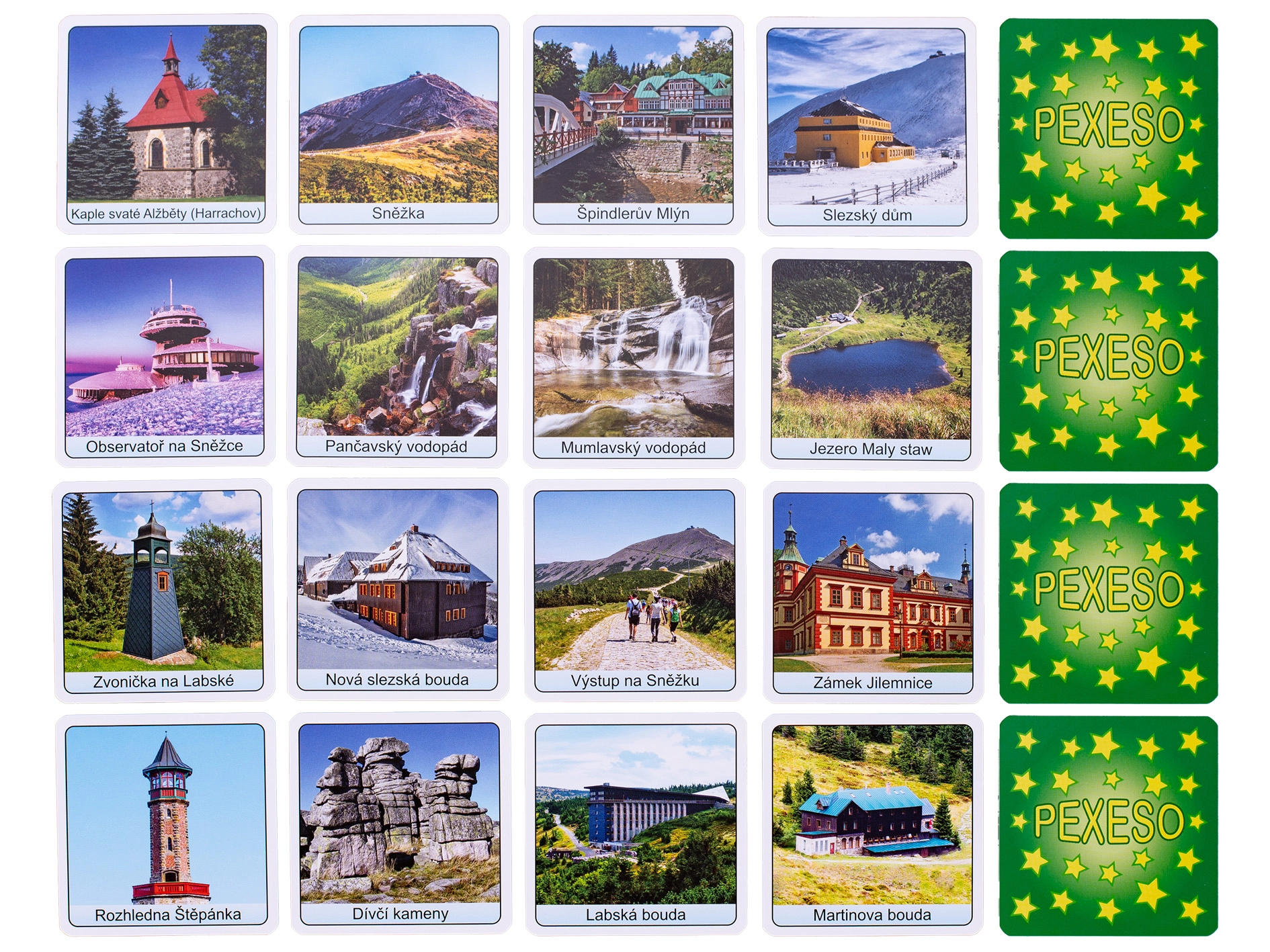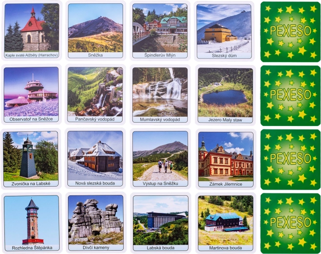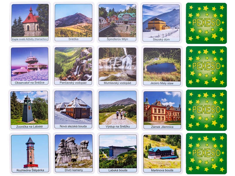 Pexeso Krkonoše este un joc de memorie îndrăgit, cu motive originale ale celui mai înalt lanț muntos din Cehia. Copiii și adulții își exersează concentrarea, memoria și răbdarea, în timp ce descoperă locuri pitorești precum Śnieżka, Labský důl sau Černá hora. Datorită cutiei compacte, pexeso este însoțitorul ideal pentru călătorii, vacanțe și excursii de weekend.