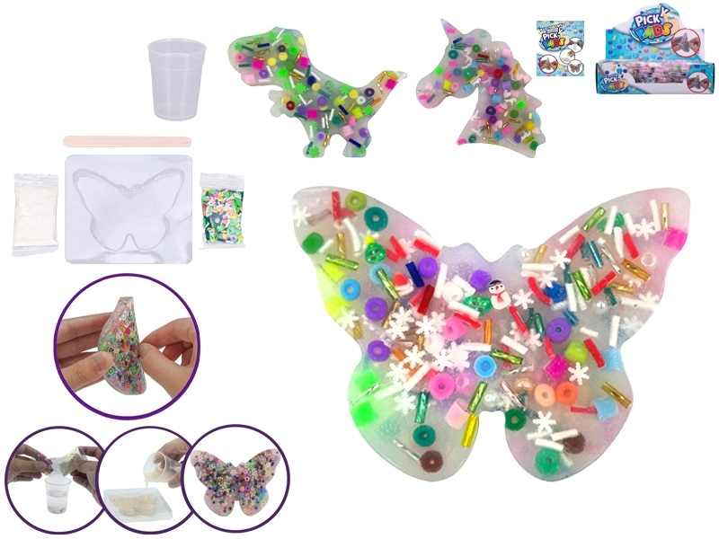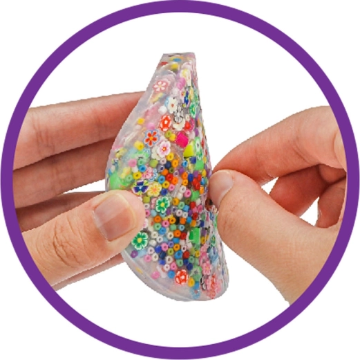 Cu acest set, copiii pot proiecta și realiza o bază gel exact după imaginația lor. Procedura este simplă: este suficient să amesteci apa cu praful inclus, să adaugi mărgelele, să torni în formă și în aproximativ 30 de minute baza este gata. Datorită celor șase forme diferite, iau naștere forme jucăușe, potrivite și ca un cadou.