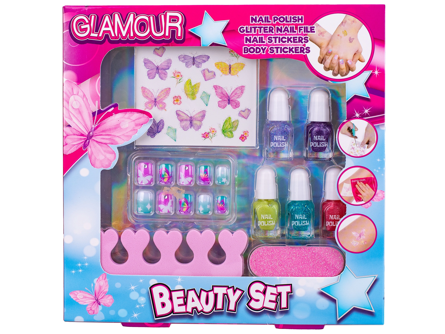 Descoperiți distracția creativă cu un set stilat pentru micile cochete. 5 lacuri de unghii colorate, autocolante pentru corp și unghii, unghii autocolante și accesorii practice îi ajută pe cei mici să-și dezvolte creativitatea și motricitatea fină – totul conceput cu accent pe siguranță și pentru copii de la 3 ani.