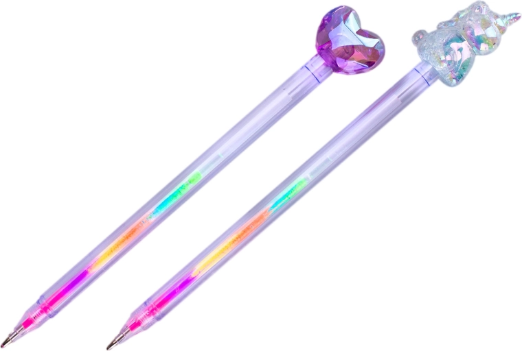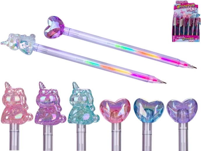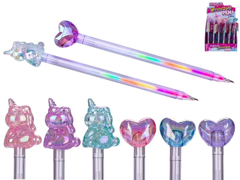 Pixul multicolor GLAMOUR, stilat și practic, aduce distracție și utilitate la școală și la birou. Datorită mai multor rezerve colorate într-un singur pix, schimbi ușor culorile după dispoziție. Forma ergonomică asigură o scriere confortabilă chiar și în utilizare prelungită, iar designul atrăgător cu inimă sau inorog îi va încânta atât pe copii, cât și pe adulți. Potrivit pentru copii de la 3 ani.