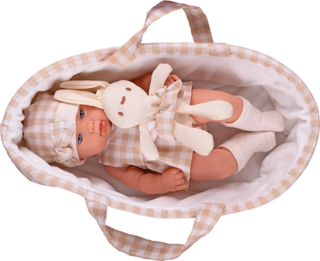 O păpușă adorabilă de 33 cm, cu corp tare și detalii realiste, care va încânta orice mic îngrijitor. Are ochi deschiși, guriță ușor întredeschisă și este asortată în tonuri elegante de bej. Include un port-bebe și un iepuraș de pluș pentru a dezvolta empatia și imaginația. Livrată în cutie cadou, ideală pentru a fi dăruită.