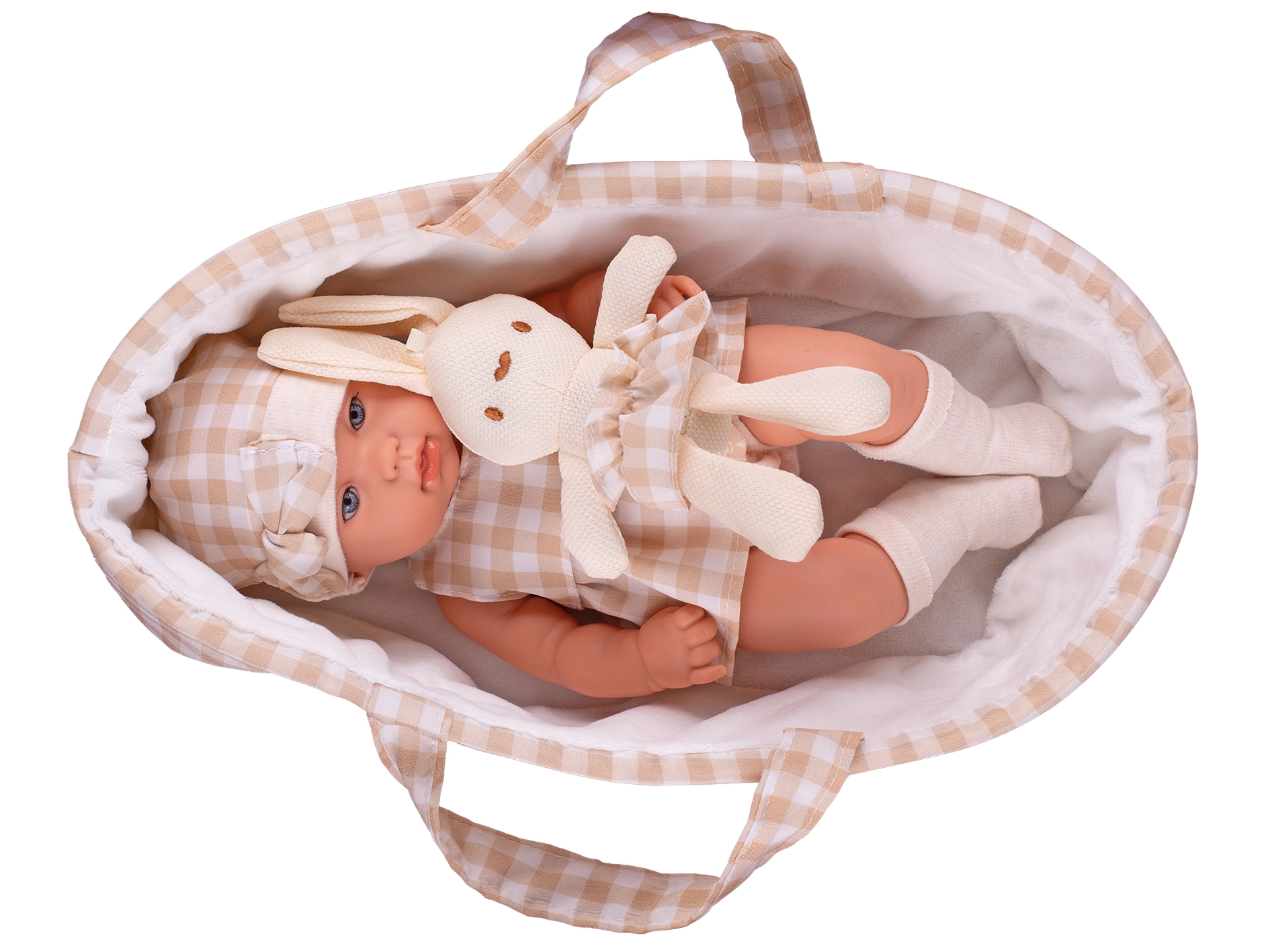 - Set complet: păpușă, port-bebe și iepuraș de pluș în nuanțe asortate de bej.