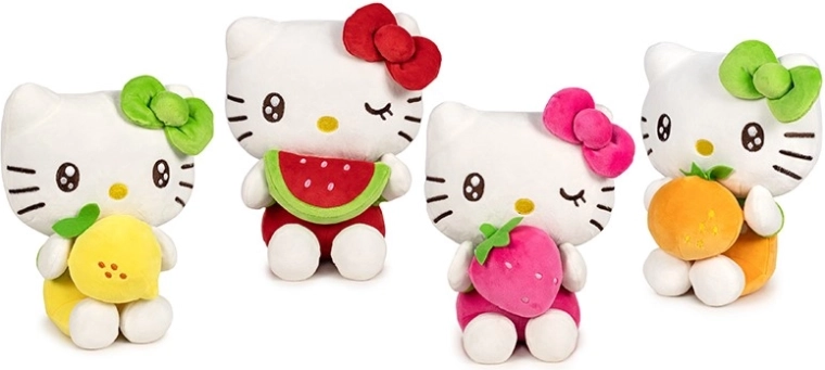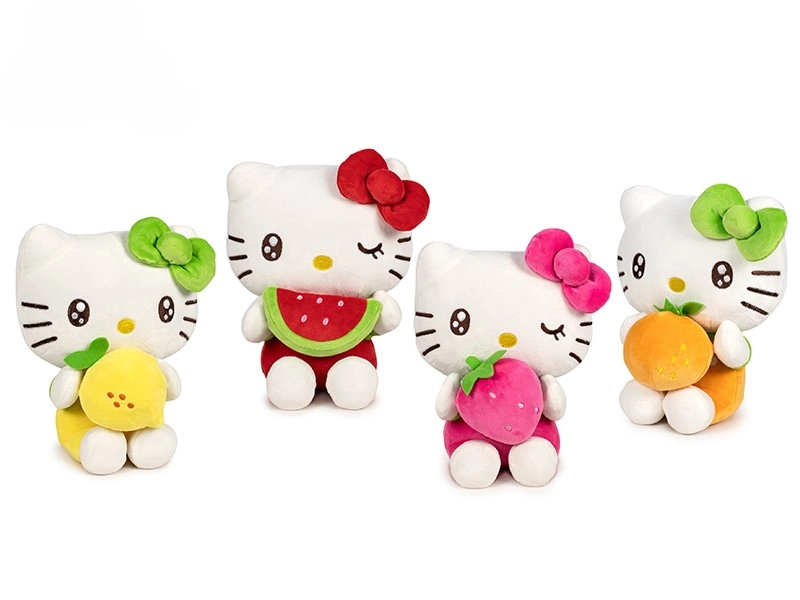 Hello Kitty sosește într-o versiune de pluș delicat finisată, sigură pentru cei mai mici. Figurina așezată ține fructe în lăbuțe și, datorită plușului moale și plăcut la atingere, invită la îmbrățișat și joacă. Se potrivește de minune în cărucior, pătuț sau ca decorațiune în camera copilului.