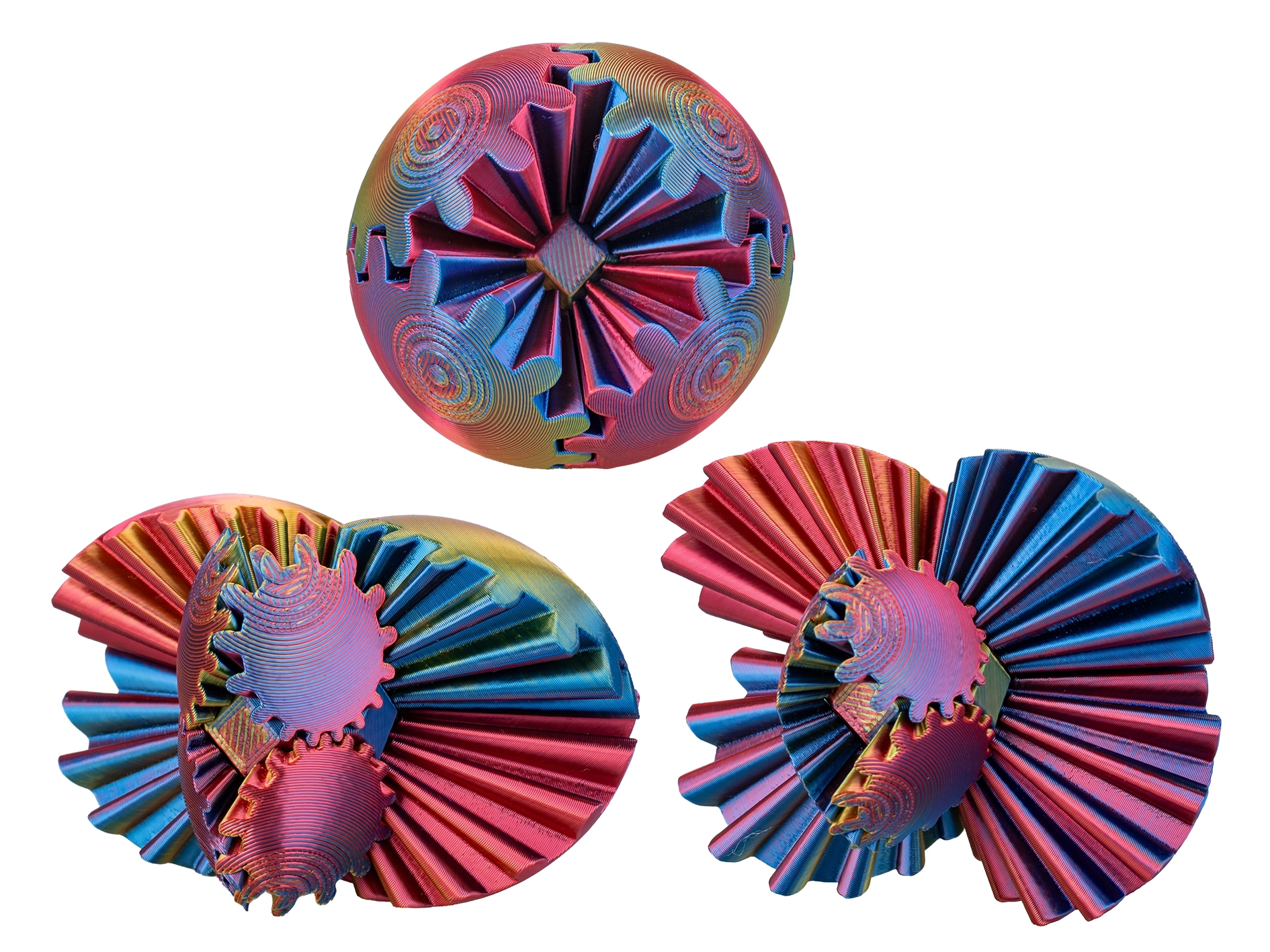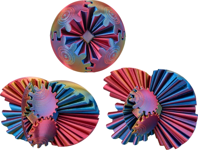 Descoperă mingea puzzle antistres bicoloră cu diametrul de 6 cm, care, atunci când este desfăcută, dezvăluie o formă fractală spiralată cu sistem de roți dințate. Datorită asamblării și dezasamblării fluide, eliberează excelent tensiunea, îți ocupă mâinile și sprijină concentrarea și gândirea logică. Dimensiunile compacte o fac un companion ideal de călătorie.