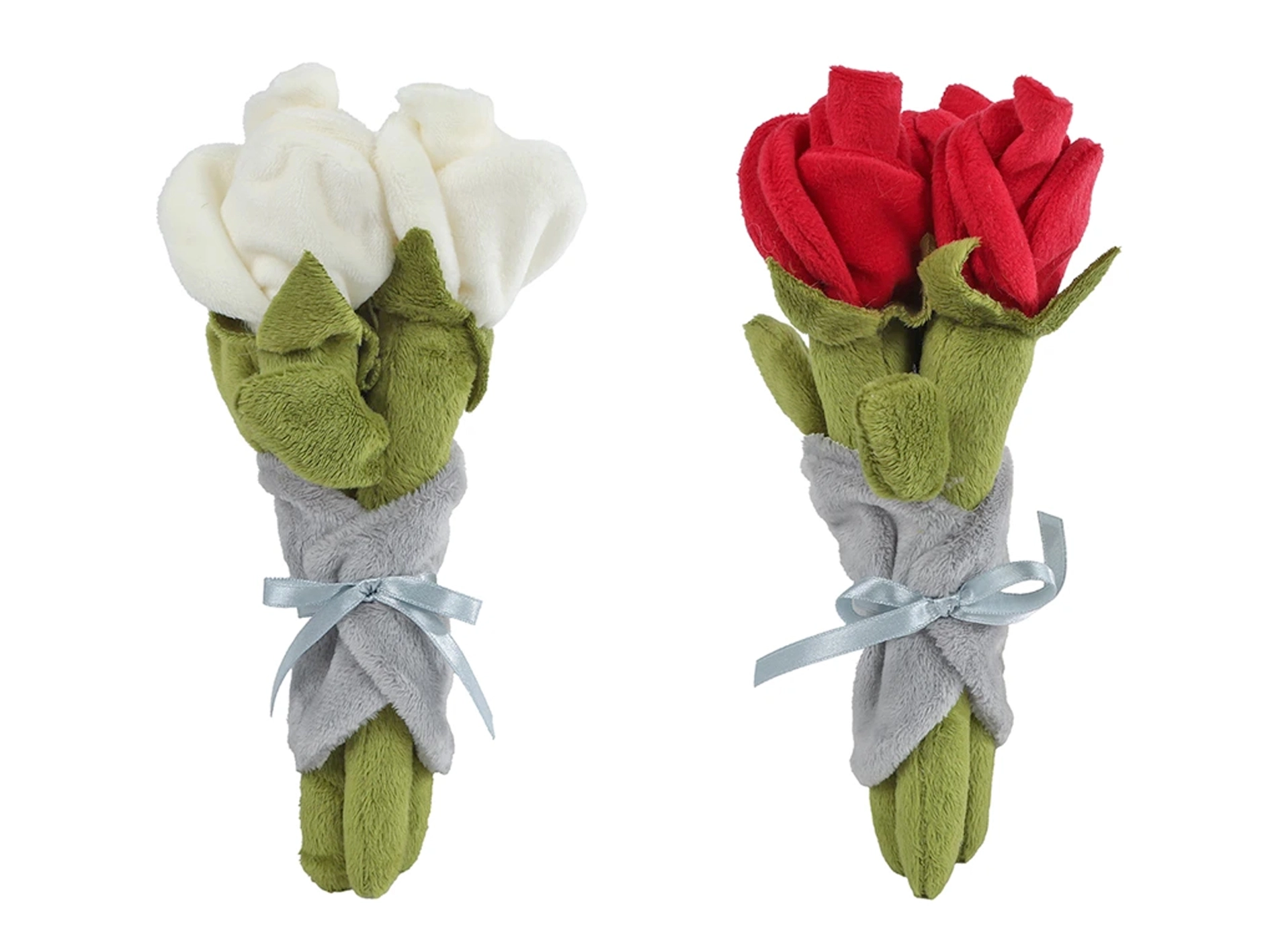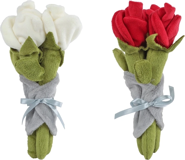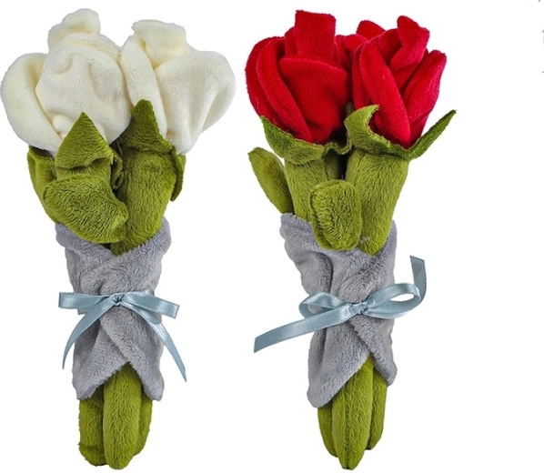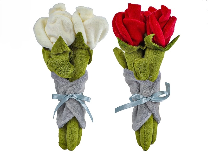 Un cadou original și durabil, care nu se ofilește niciodată. Acest buchet drăgălaș din pluș, cu petale lucrate în detaliu, este ambalat elegant în pluș gri moale și legat cu o fundă satinatã. Este ideal pentru a exprima dragostea, prietenia sau ca decorațiune pentru camera copilului. Disponibil în două culori – alb și roșu. Construcția sigură este potrivită pentru copii de la naștere.