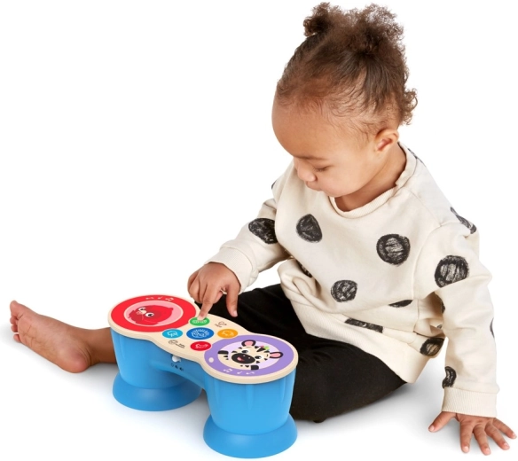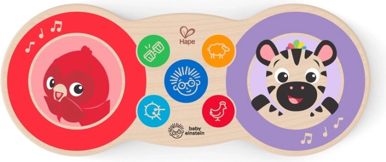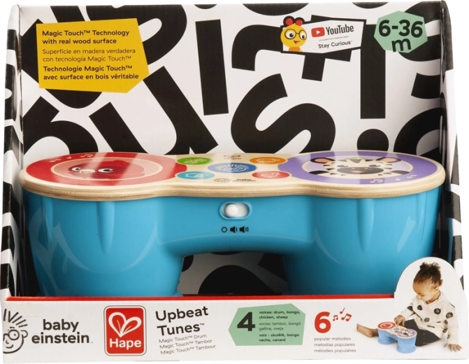 Descoperă bucuria muzicii cu tobele pentru copii Baby Einstein Magic Touch Upbeat Tunes. Suprafața din lemn cu tehnologia Magic Touch răspunde la atingeri fine și le permite copiilor de la 6 luni să redea melodii clasice, să comute între sunete de tobă și bongo și amuzante sunete de animăluțe. Prin apăsarea butonului lui Einstein pornești 6 melodii îndrăgite. O jucărie excelentă pentru dezvoltarea motricității fine, a ritmului și a exprimării creative.