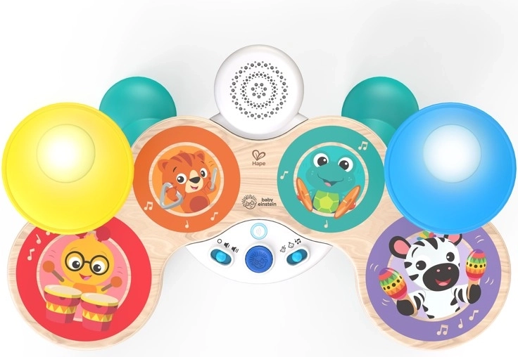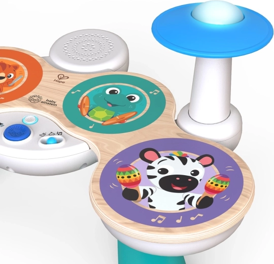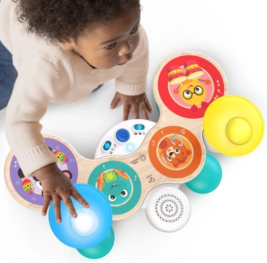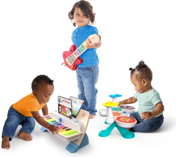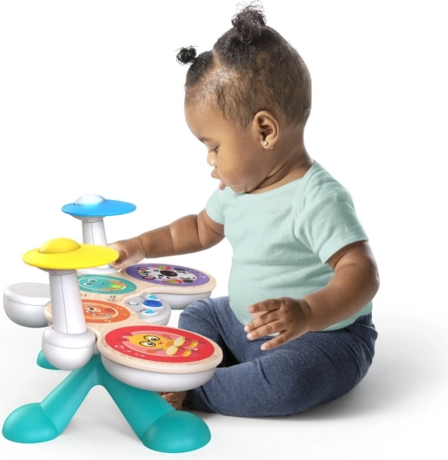 Setul de tobe pentru copii BABY EINSTEIN x HAPE Together in Tune aduce joacă inteligentă pentru cei mici. Aspectul din lemn și construcția durabilă sunt completate de tehnologia premiată Magic Touch, datorită căreia chiar și o atingere ușoară pe suprafețele pictate declanșează sunete autentice de tobe. Datorită conectivității wireless, copiii pot cânta solo sau împreună cu pianul și chitara din aceeași serie, creând o mică trupă acasă.