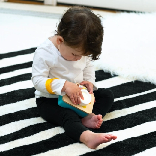 Datorită dimensiunilor compacte, suprafeței din lemn inspirate de Montessori și curelușei sigure, este ideal atât acasă, cât și în călătorii. Jucăria dezvoltă motricitatea fină, coordonarea mână-ochi și îi ajută pe copii să înțeleagă relația cauză-efect – totul prin joc plăcut.