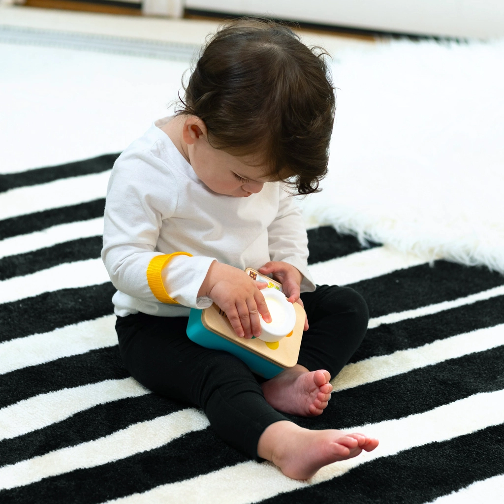 Descoperă învățarea distractivă cu aparatul foto interactiv BABY EINSTEIN x HAPE, care combină efecte luminoase, melodii și învățarea culorilor în 4 limbi. Copiii își exersează motricitatea fină, înțeleg cauza și efectul și, datorită curelușei pentru încheietură, pot lua jucăria oriunde. Suprafața din lemn cu certificare FSC și designul retro se potrivesc perfect mâinilor mici.