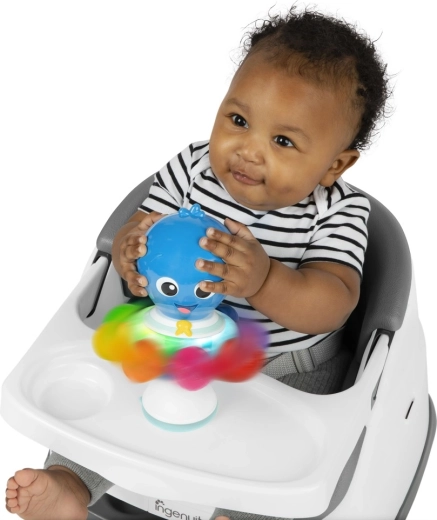 Jucăria senzorială cu ventuză Baby Einstein Opus Spin & Sea este concepută pentru învățare multisenzorială. După apăsarea butonului, caracatița începe să se învârtă și să lumineze, în timp ce elementele colorate și texturate invită la prindere și explorare. Baza stabilă cu o ventuză mare fixează ferm jucăria pe scăunelul de masă, masă sau tavă.