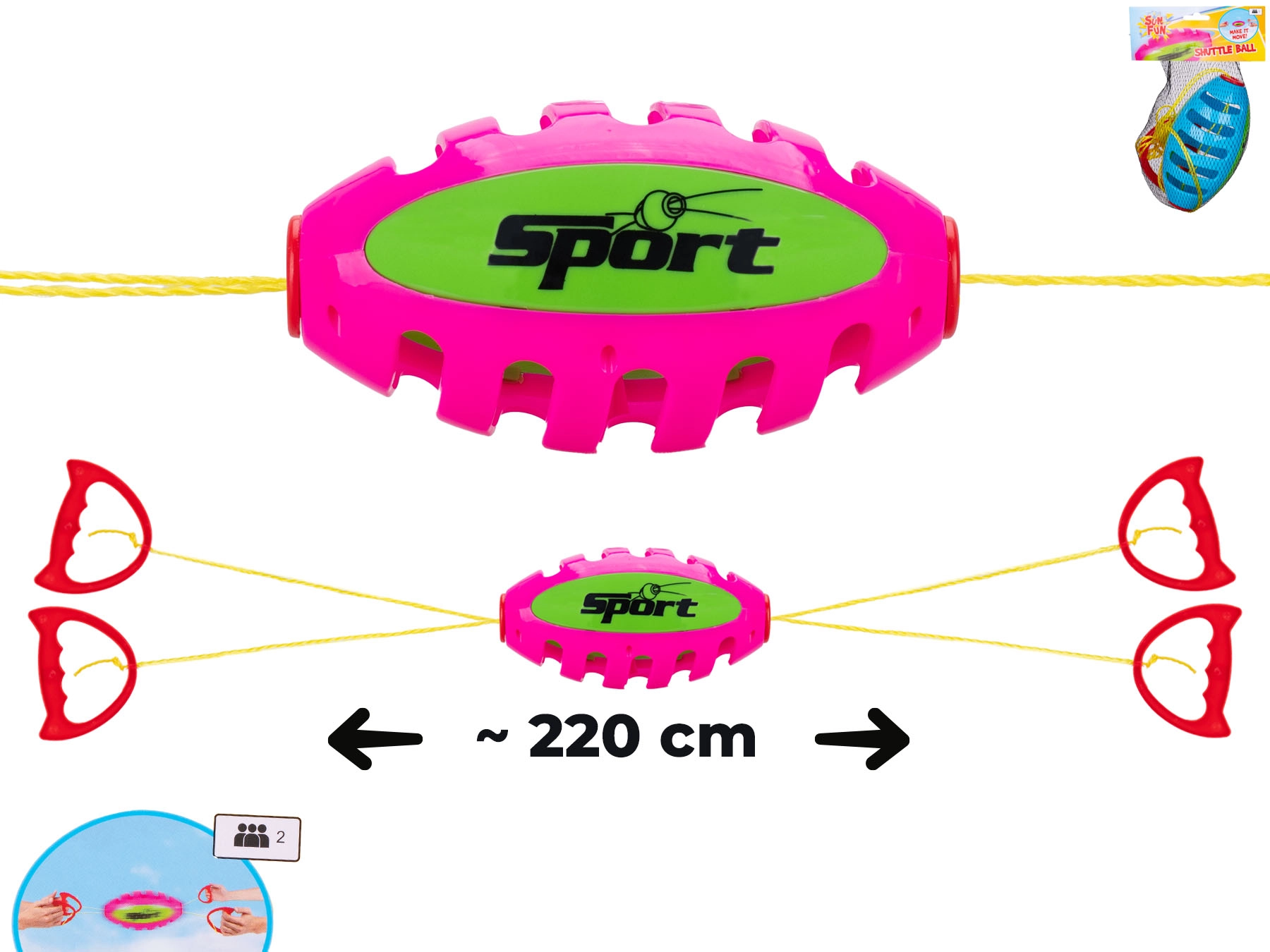 Bucurați-vă de distracție activă în aer liber cu jocul Sun Fun speedball. Acest joc dinamic pentru doi dezvoltă coordonarea, reflexele și abilitățile motorii. Cu ajutorul șnururilor cu mânere, jucătorii pun în mișcare mingea din plastic rezistentă, cu diametrul de 18 cm, înainte și înapoi. Ideal pentru grădină, parc și teren de joacă, se transportă ușor și este grozav atât pentru copiii de la 3 ani, cât și pentru adulți.