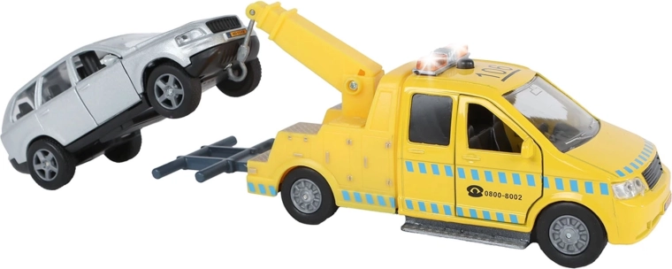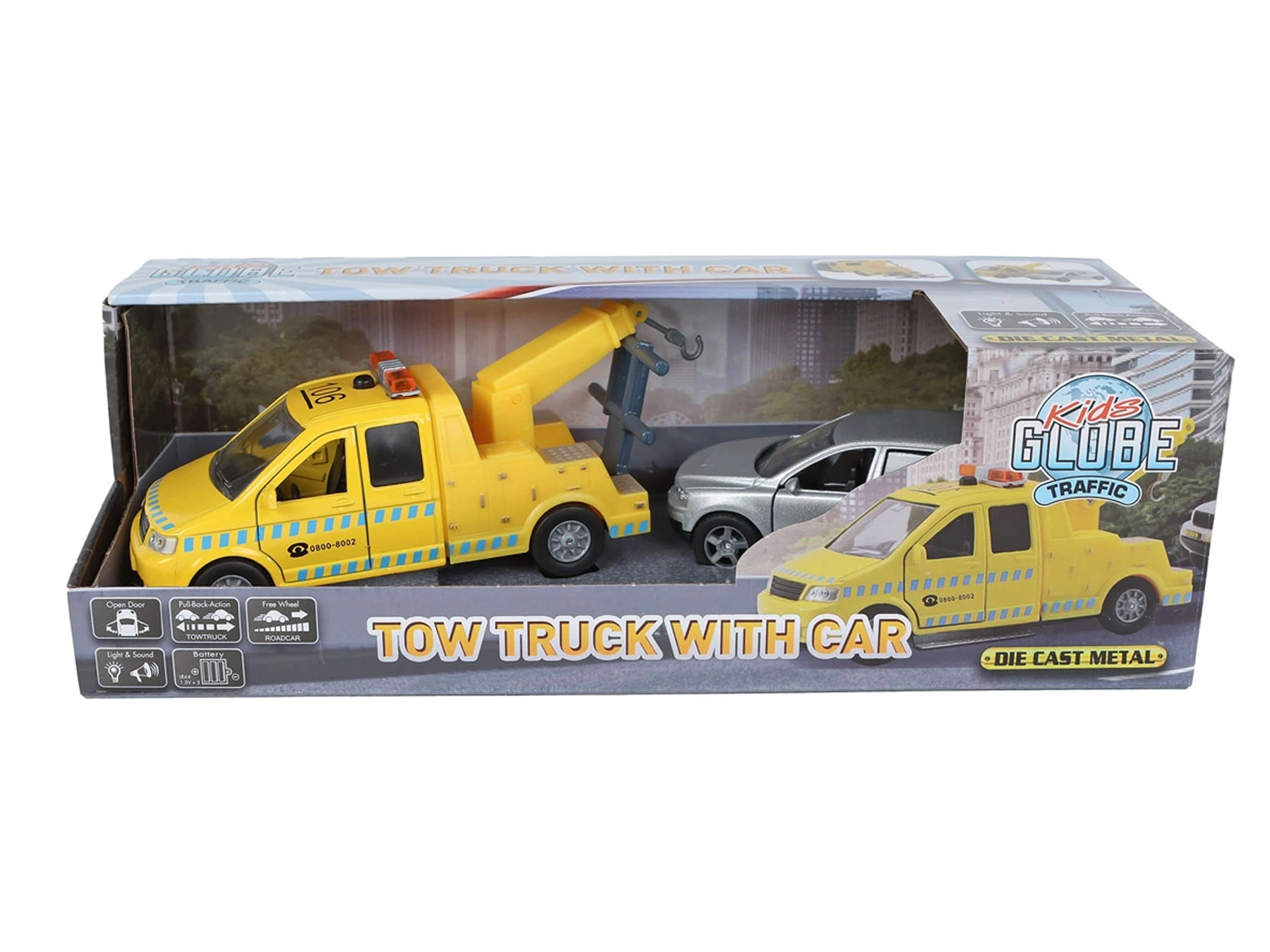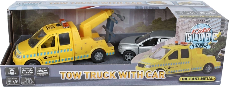 Pornește la salvarea șoselelor cu setul de remorcare Kids Globe Traffic. Setul include un vehicul de remorcare detaliat, cu lungimea de 14 cm, și un autoturism de 11,5 cm, care poate fi încărcat și transportat cu ușurință. Ambele vehicule au mecanism pull-back – trage-le înapoi și privește-le cum pornesc înainte.