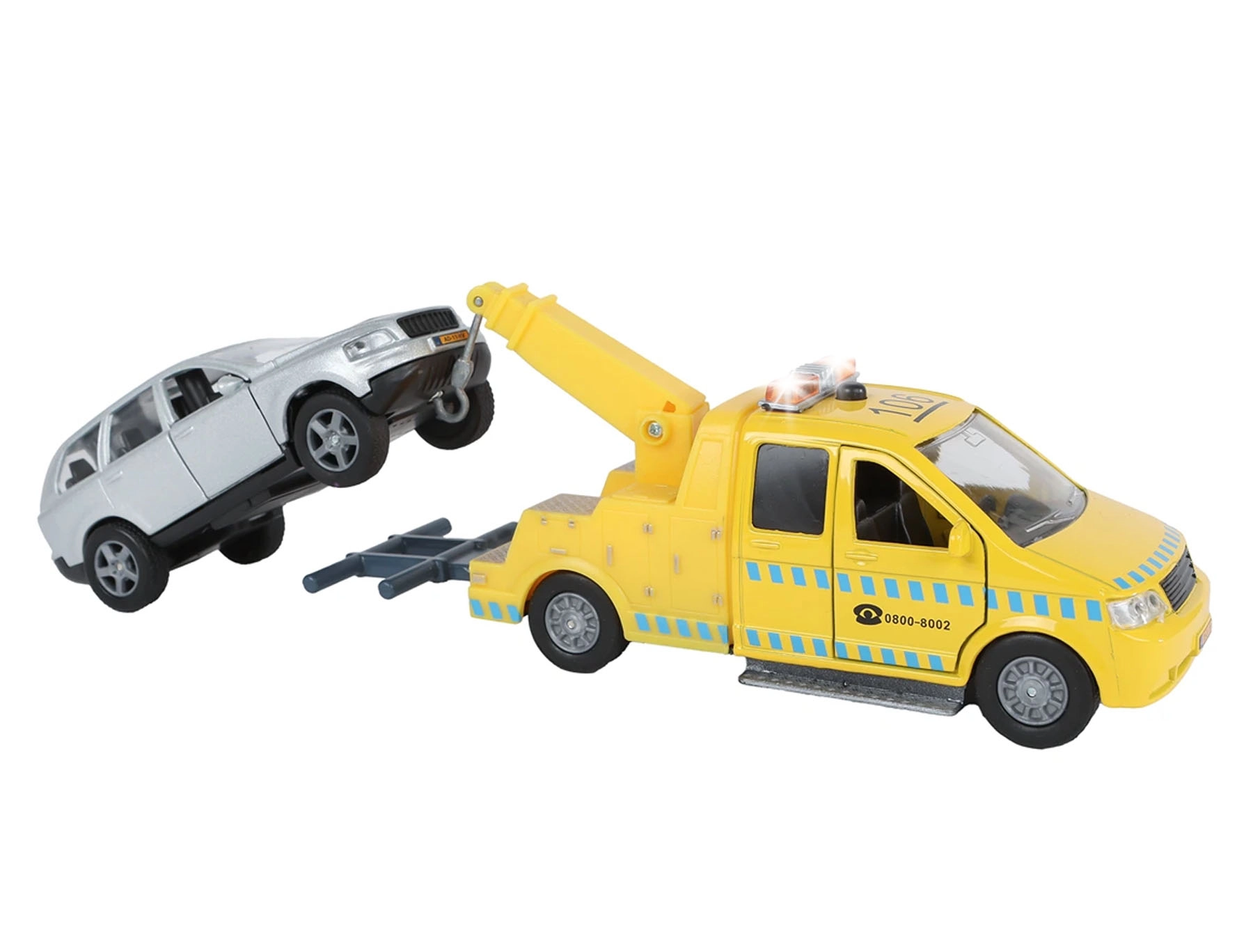 Pentru o experiență realistă, setul are efecte de lumini și sunete activate printr-un buton pe acoperișul vehiculului de remorcare. Combinația de metal și plastic asigură durabilitate îndelungată chiar și în cazul unei utilizări frecvente. Datorită bateriilor incluse, setul este gata de folosit imediat și dezvoltă excelent imaginația și motricitatea copiilor.