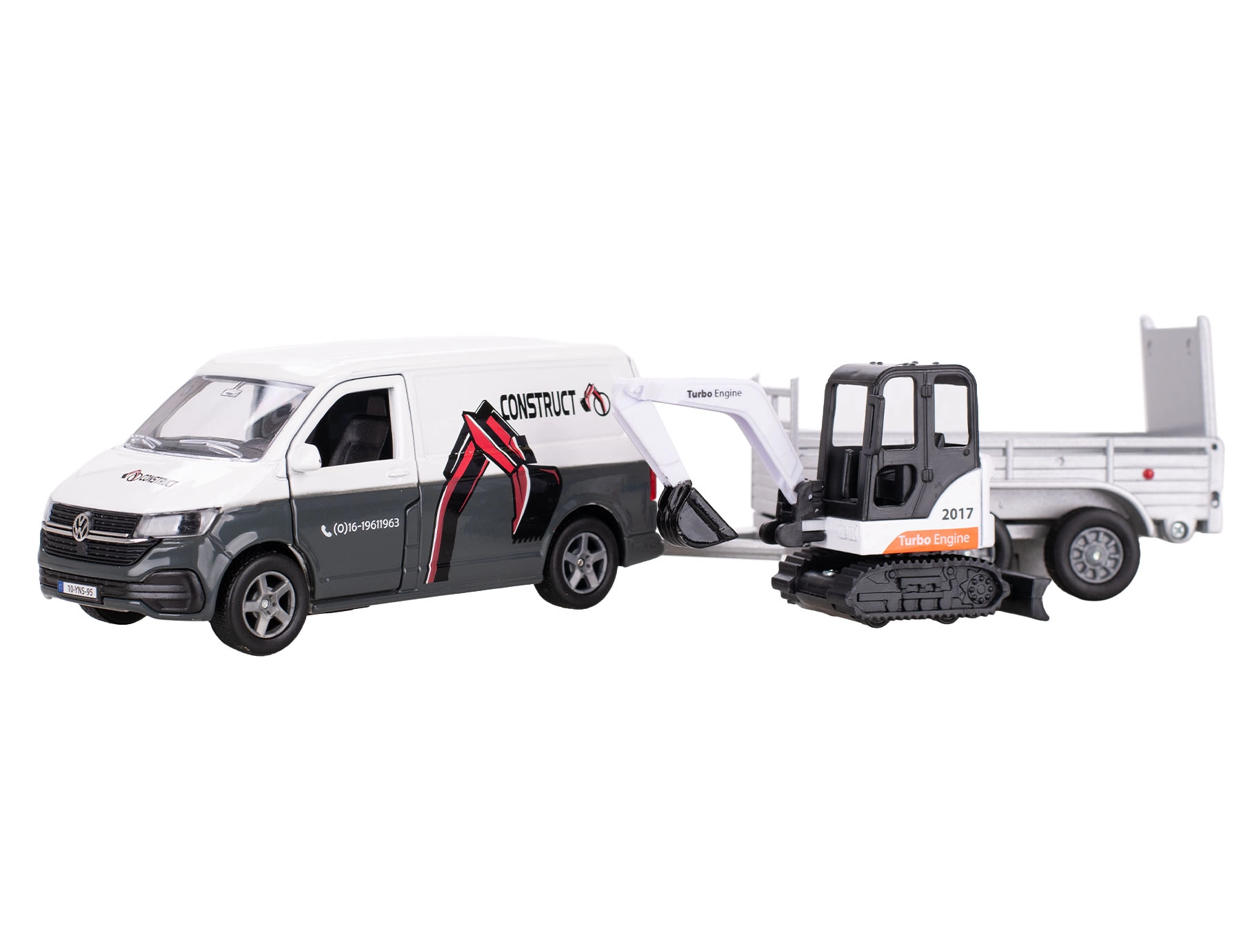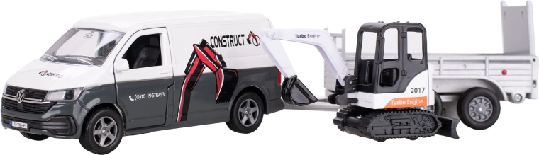 - Set realist: VW Transporter, remorcă detașabilă și mini-excavator funcțional