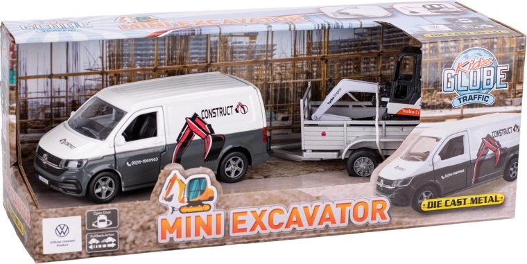 Cu setul Kids Globe Traffic, copiii își pot crea cu ușurință propriul șantier. Realistul VW Transporter cu mecanism de recul transportă în siguranță mini-excavatorul pe remorca detașabilă, pentru a începe imediat lucrările de „săpătură”. Construcția durabilă din metal și plastic asigură o durată de viață îndelungată chiar și în cazul unei utilizări intense.