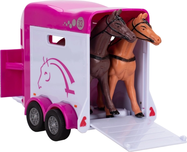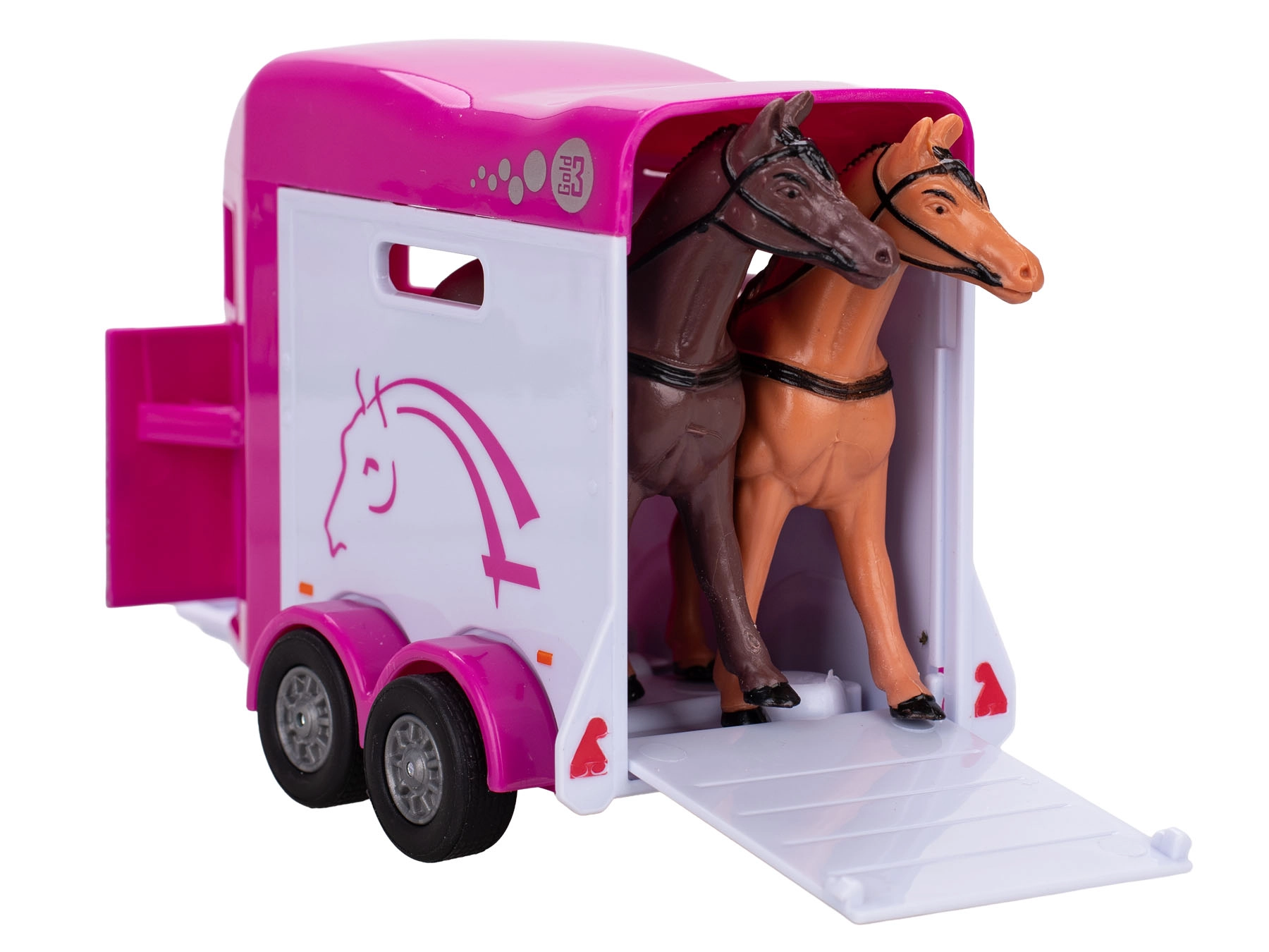 Remorca este proiectată pentru încărcarea și transportul în siguranță al căluților și completează perfect scenariile copiilor, de la fermă la concursuri ecvestre. Modelul este compatibil cu figurinele obișnuite de cai (nu sunt incluse în pachet), iar prin dimensiunile sale de 28 cm se evidențiază în orice colecție.
