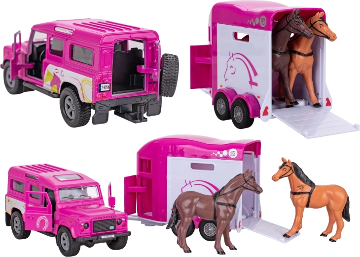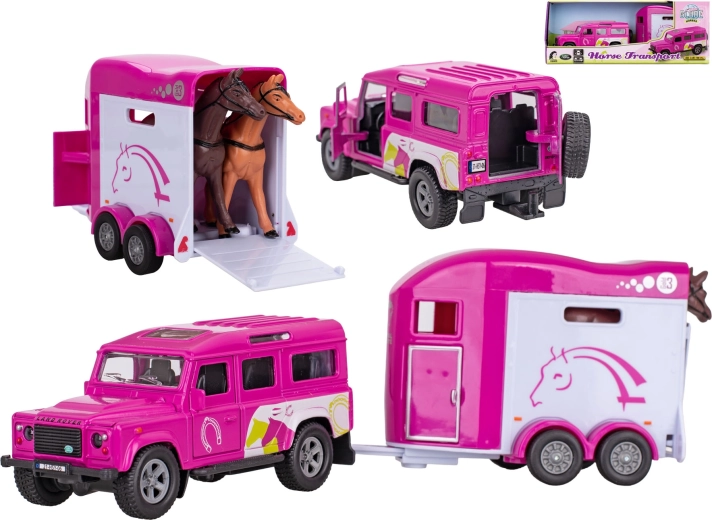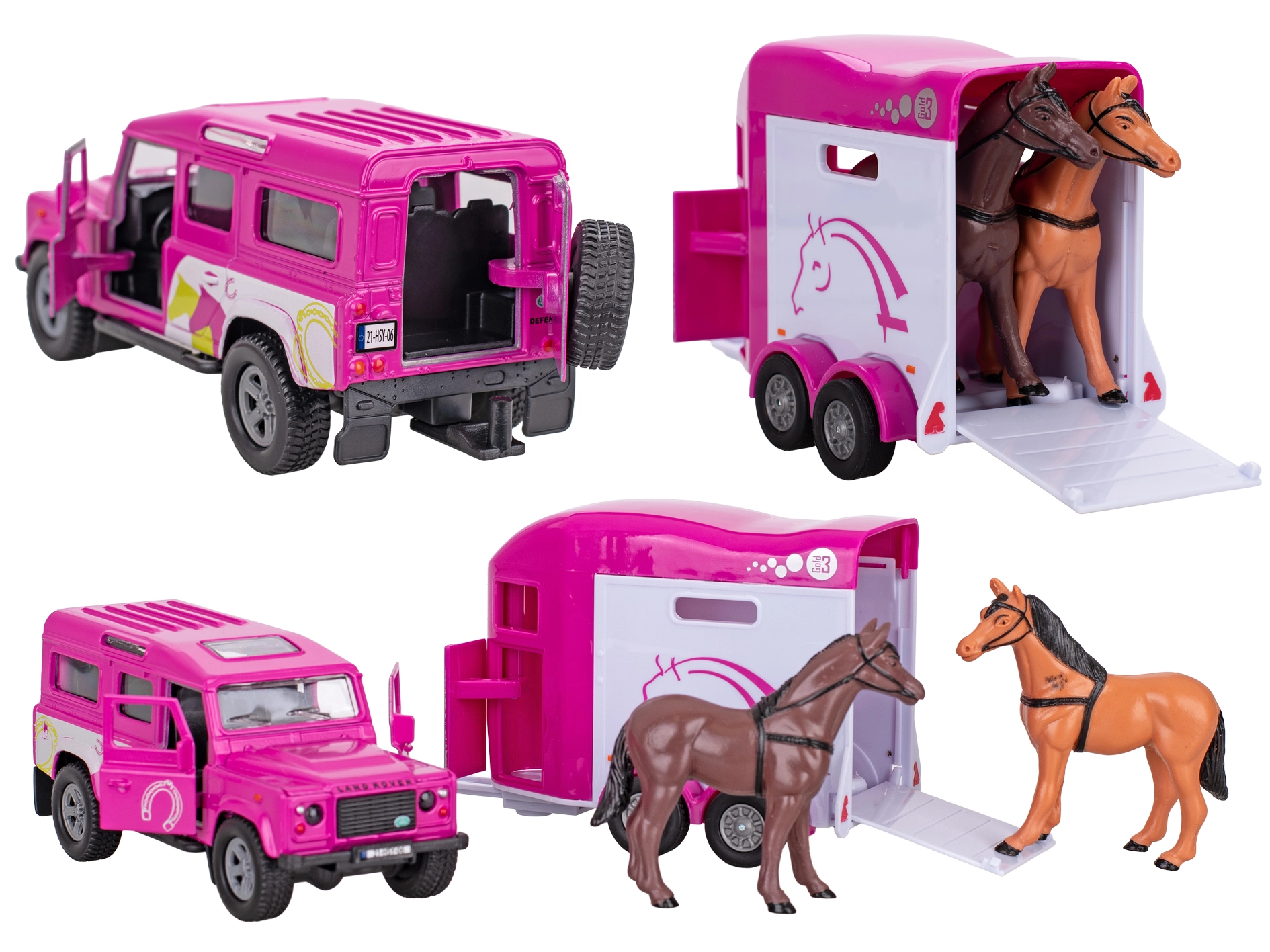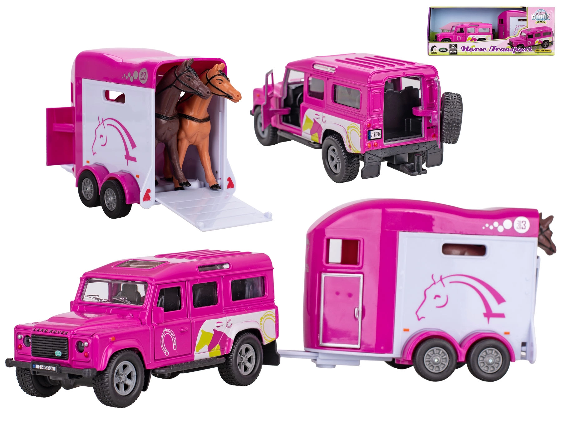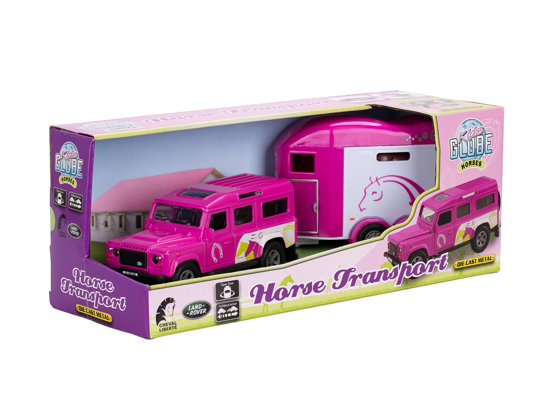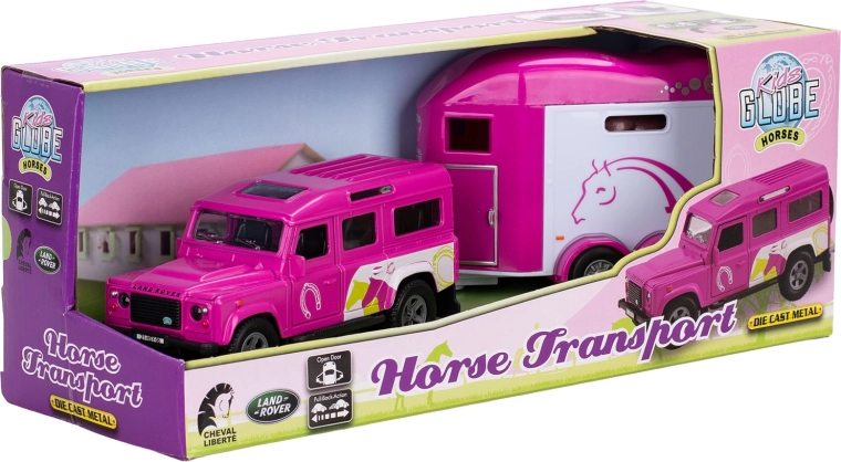Descoperă setul realist Kids Globe cu vehiculul iconic Land Rover și remorcă pentru transportul cailor, într-o nuanță atrăgătoare de roz. Execuția detaliată a caroseriei și a interiorului, ușile față funcționale și mecanismul de întoarcere oferă numeroase posibilități de joacă și distracție. Datorită combinației de metal și plastic de calitate, modelul este durabil și pregătit pentru joaca zilnică.