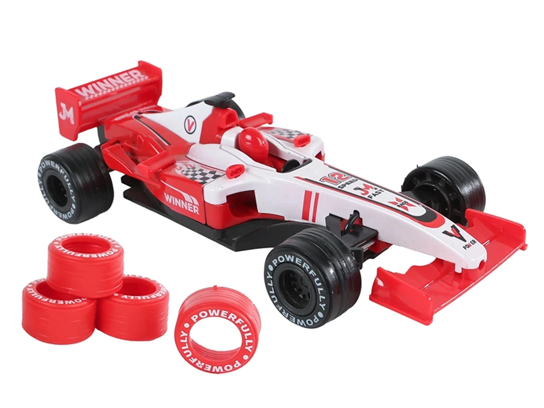 Pachetul include anvelope de rezervă, cu care copiii pot simula cu ușurință schimbarea roților, adăugând un element realist de îngrijire a „mașinii de curse”. Modelul este disponibil în două culori atractive – roșu și albastru – și este potrivit pentru copii de la 3 ani. Jocul cu mașinuța sprijină dezvoltarea motricității fine, coordonarea mână–ochi și stimulează creativitatea și imaginația.