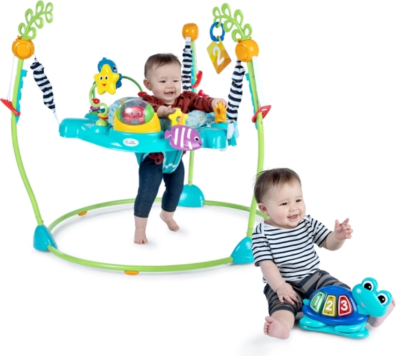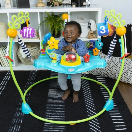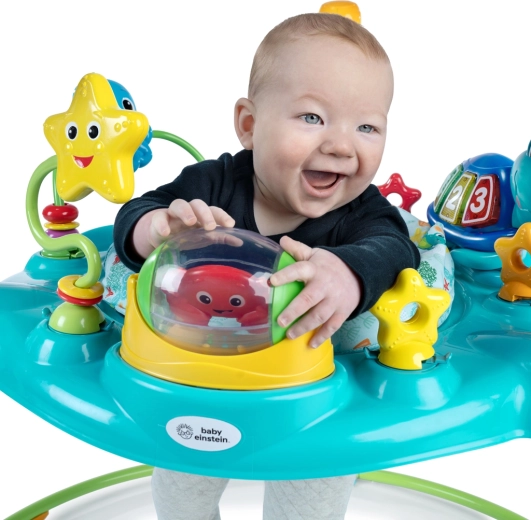 Curiosity Cove transformă fiecare zi într-o aventură – bebelușul poate sări, se poate roti și poate explora în siguranță datorită scăunelului rotativ la 360° și activităților marine variate. Panoul interactiv cu lumini și sunete, mărgelele, peștișorul, crabii cu bilă rotativă și cardurile cu imagini susțin motricitatea fină, dezvoltarea senzorială și primele cunoștințe.