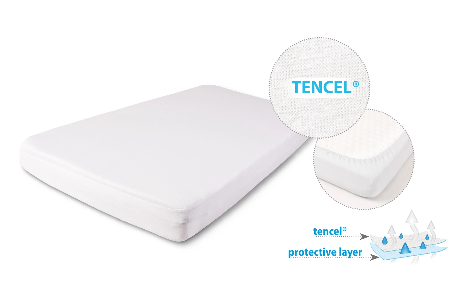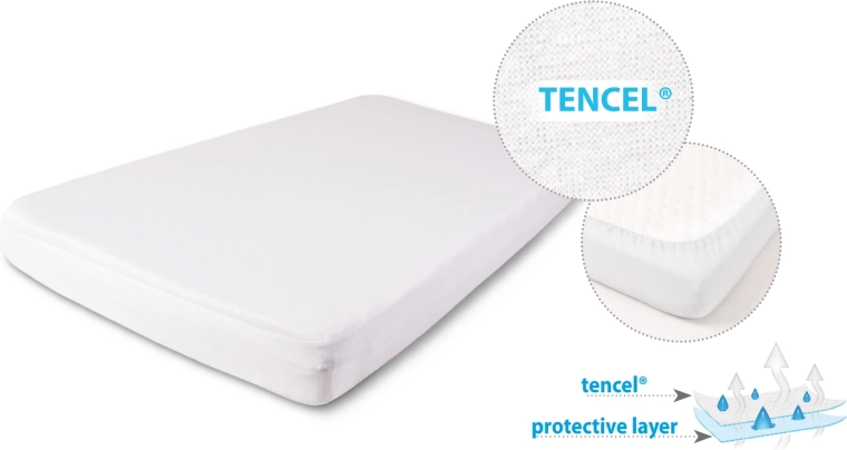 Cearșaf practic și confortabil din fibră Tencel cu membrană impermeabilă și în același timp respirabilă, care protejează salteaua împotriva umezelii și petelor. Datorită elasticului cusut, stă perfect pe poziție, este delicat cu pielea, antialergic și potrivit pentru pătuțuri pentru copii.