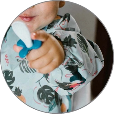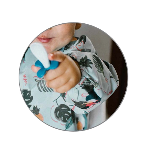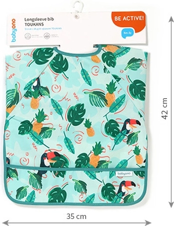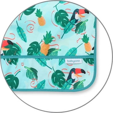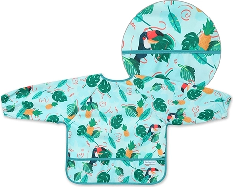 O bavetă stilată și funcțională, cu imprimeu de tucani, oferă acoperire completă a trunchiului și mânecilor, astfel încât hainele rămân curate la fiecare masă și în timpul jocului dezordonat. Datorită materialului impermeabil și ușor de curățat, este ideală pentru primele mese independente și pentru activități creative.