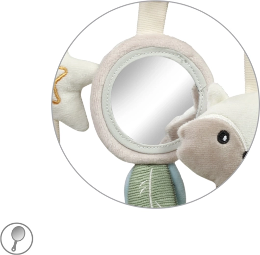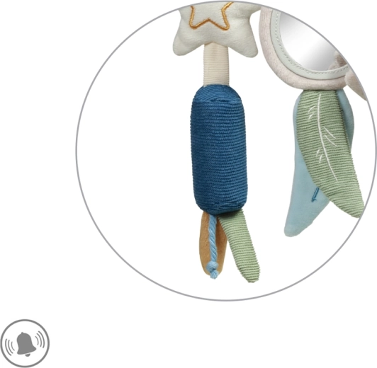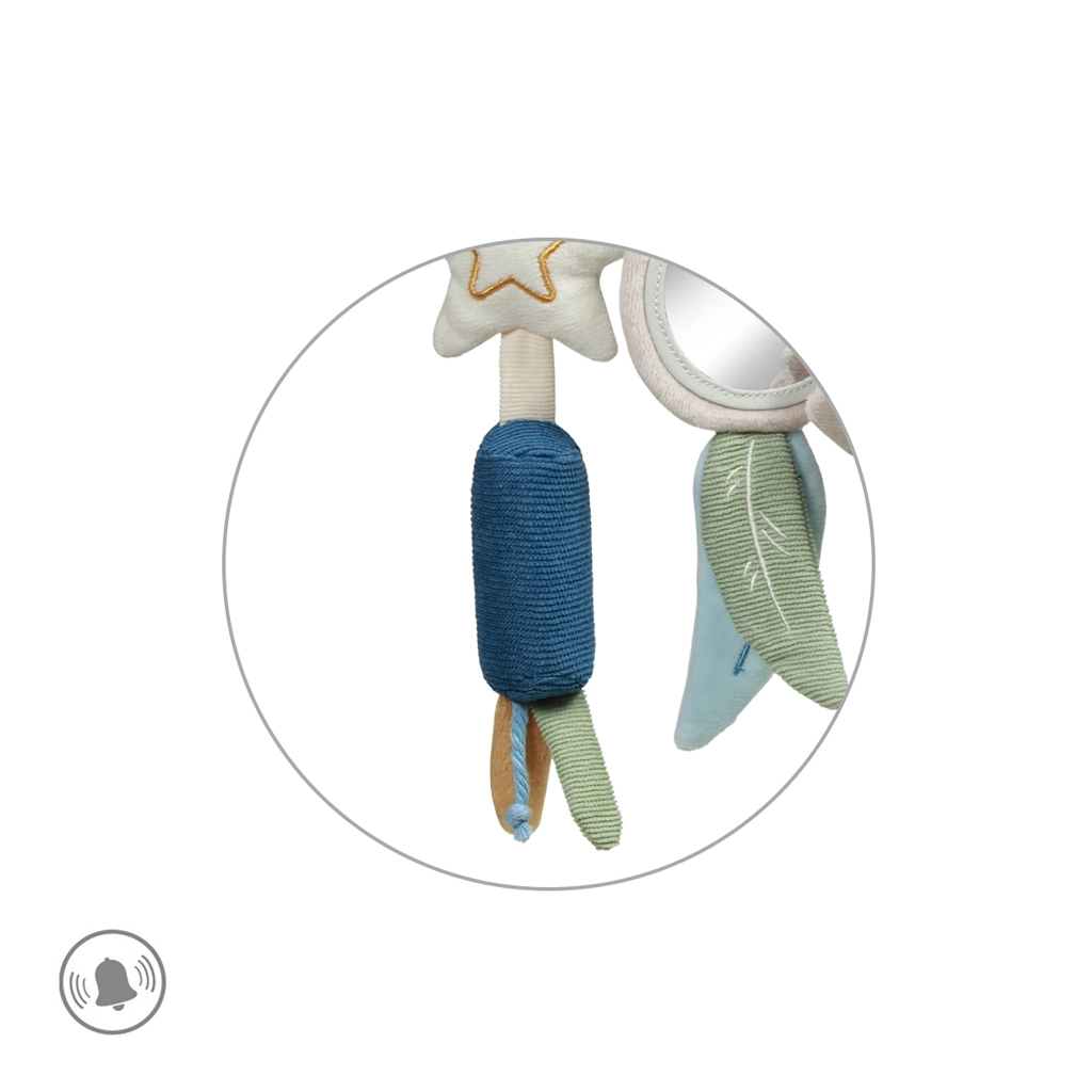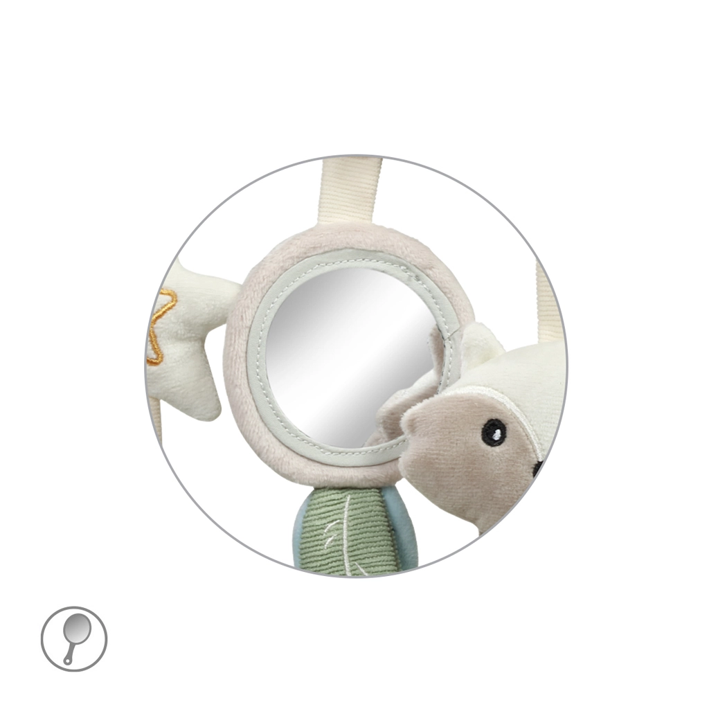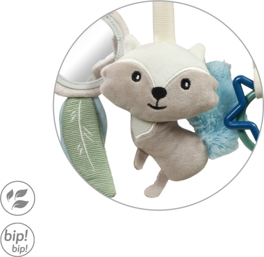 Include elemente îndrăgite: oglindă flexibilă pentru descoperirea propriei reflecții, frunzulițe și coadă foșnitoare ale ratonului pentru antrenarea atenției, clopoței cu sunet discret pentru liniștire și jucărie de dentiție în formă de stea pentru alinarea erupției dentare. Detaliile bine gândite mențin interesul copilului și sprijină coordonarea mână–ochi.