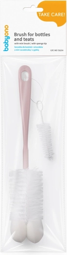 Perie practică BabyOno pentru curățarea temeinică a biberoanelor și tetinelor. Perii special conturați ajung și în zonele greu accesibile, mânerul comod asigură o prindere fermă, iar buretele de la capăt facilitează curățarea fundului biberonului. Include mini periuță pentru tetine și un sistem practic de depozitare a acesteia.